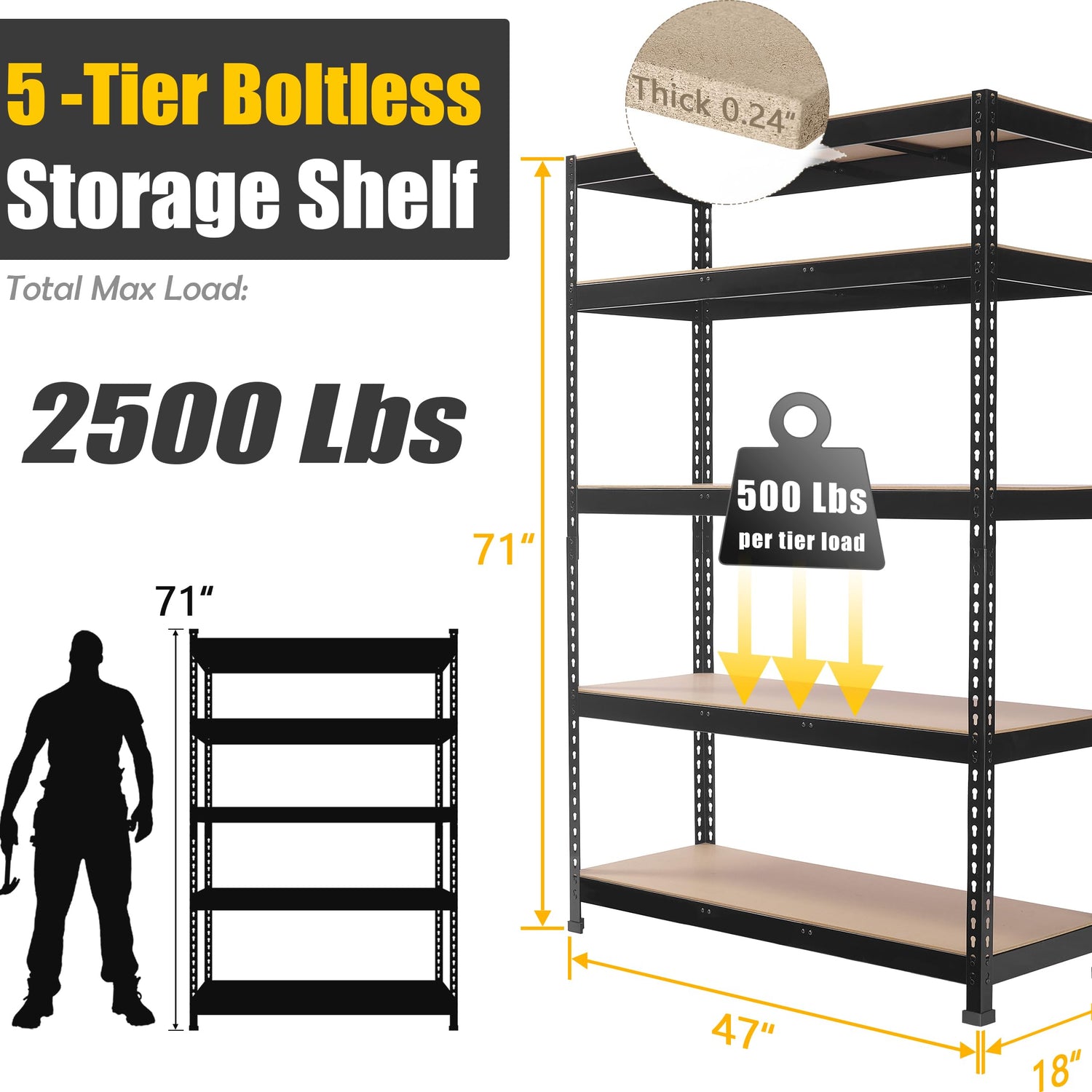 - 【Heavy Duty Shelves with 2 Reinforced Support Beams】PrimeZone garage storage shelves measuring 48" W x 18" D x 72" H which allows for efficient plenty of storage of heavy duty items. With 2 reinforced support beams at the bottom, each shelf can hold up to 500 lbs, providing a total load capacity of 2500 lbs across the entire shelving unit. It's suitable for storage heavy duty items such as garage storage, storage boxes, garage tools, cleaning supplies, and so on