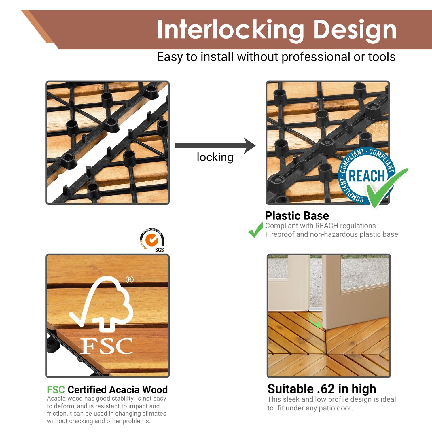 - 【Safe and Slip-resistant】-Compared to plastic interlocking deck tiles, FSC-certified Acacia wood deck tiles are designed with safety in mind, The wood-textured surface of the flooring tiles provides better traction that ensures you won't skid or fall when walking. Making them safe and perfect for high-traffic areas.
