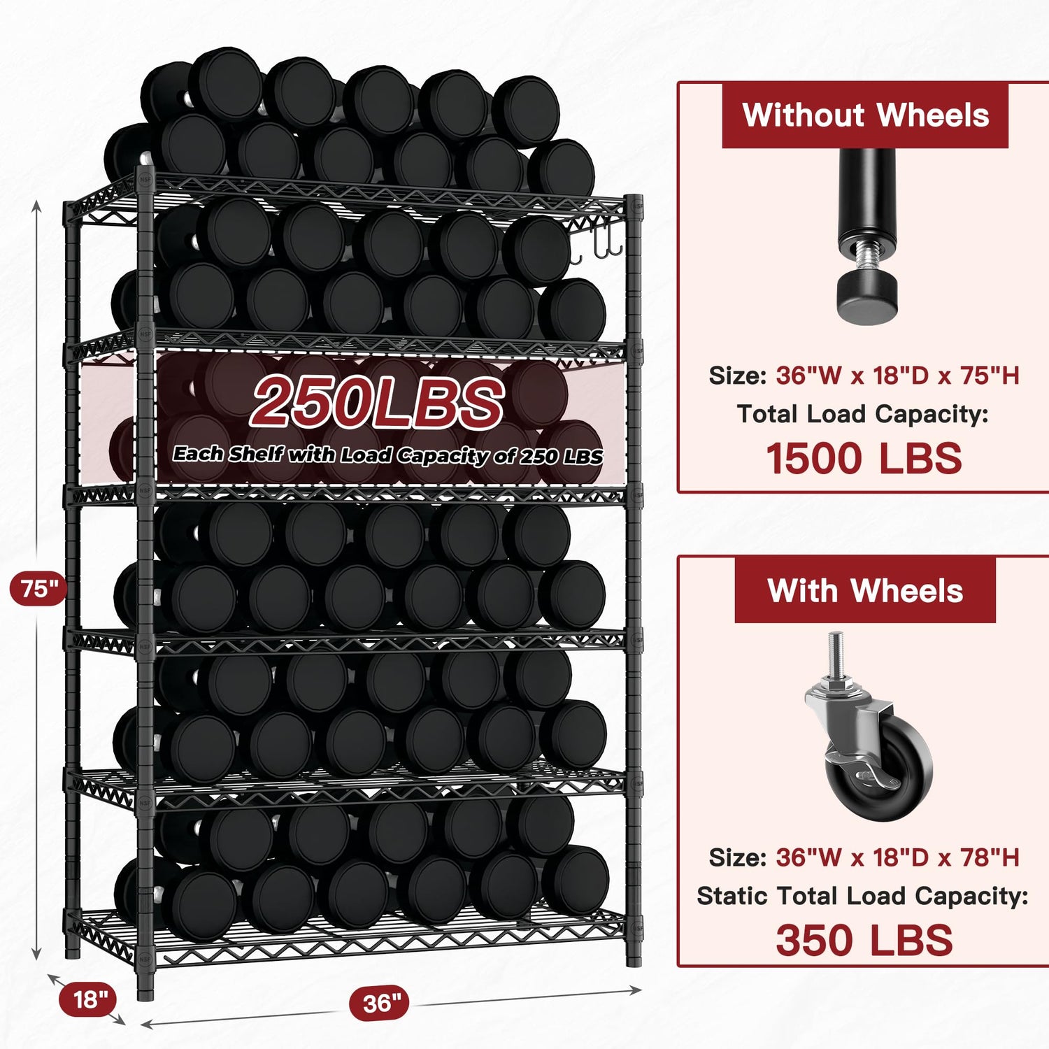 - 【Excellent Load-bearing Capacity】This wire shelving rack is made of alloy steel, with a strong and enduring structure composed of bolded metal wire and metal rods. The total weight capacity of 6 shelves is up to 1,500 lbs, with each shelf supporting up to 250 lbs. (Note: When wire shelving unit is on wheels, the total load capacity is only 350 lbs)
