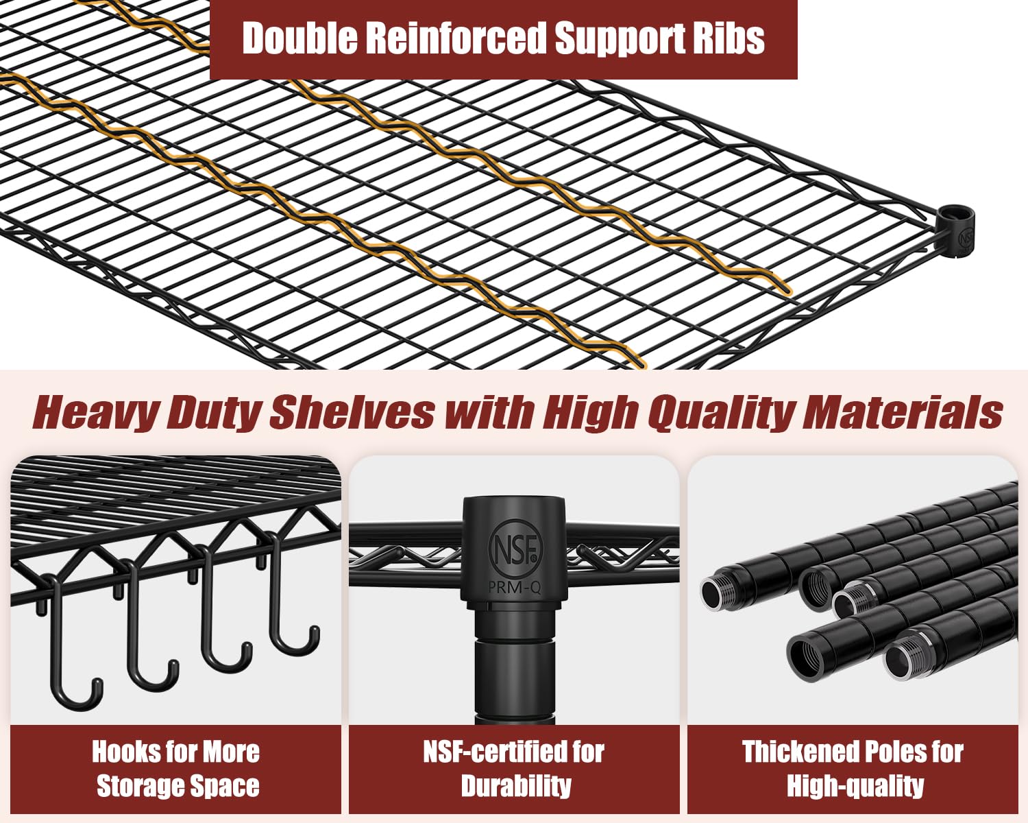 - 【60"W Super Wide Adjustable Storage Space with Hooks】 This 4 tier heavy duty storage shelves has a generous wide size of 60" W x 24" D x 76" H, providing ample vertical storage space. The height between the shelves is adjustable to store items of different sizes such as storage boxes, tools, microwave, baker, drinks, food, spices, fish tanks, books, kitchen utensils, etc. In addition, our wire metal shelving come with 4 hooks for hanging towels, tote, clothes, etc
