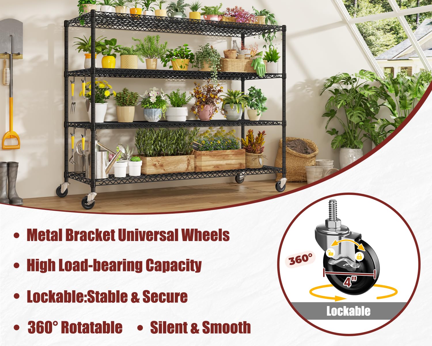 - 【2800 LBS Capacity Heavy Duty Shelves】 This wire rack is made of alloy steel, with a strong and enduring structure composed of bolded metal wire and industrial high-strength metal rods. The total weight capacity of 4 shelves is up to 2,800 lbs without wheels, with each shelf supporting up to 700 lbs, so even a large number of heavy items can be stored reliably. (Note: When wire shelving unit is on wheels, the total load capacity is only 800 lbs)