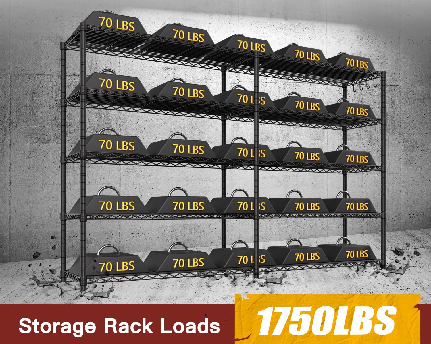 - 【Garage Shelving Heavy Duty Load 1750 LBS】This 5 tier shelving unit is constructed from high-quality, sturdy metal tubes with a diameter of 0.75 inches, designed to withstand substantial weight. Each shelf supports up to 350 lbs, with a total load capacity of 1750 lbs. The garage rack also comes with 6 adjustable legs that ensure stability, even under heavy loads or on uneven ground