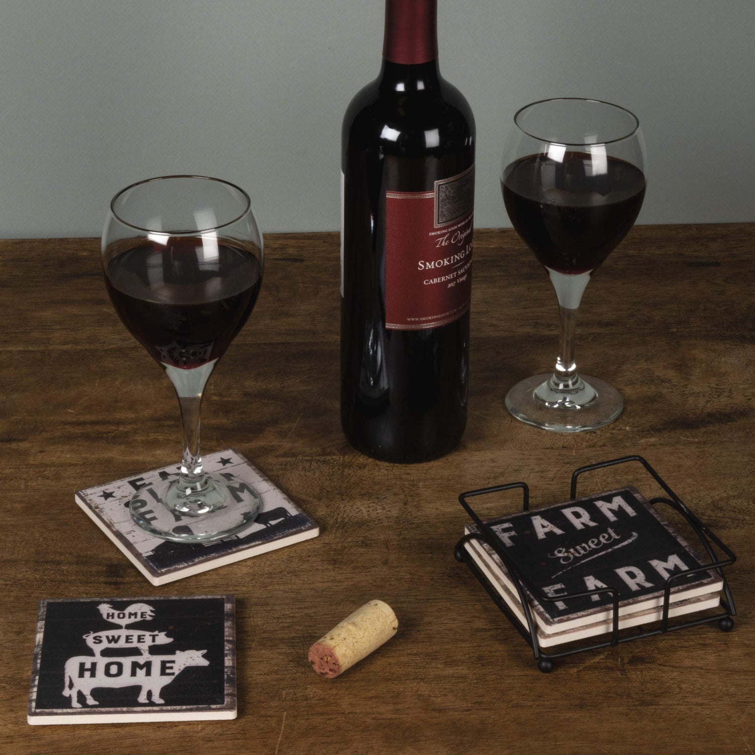 Details: A set of four absorbent stone coasters lending "Farm Sweet Farm, " "on farm time, " "Eat - Sleep - farm, " and "home sweet home" Sentiments, all with slatted wood Printed backgrounds and varying mill, Farm, Cow, and stacked animal designs