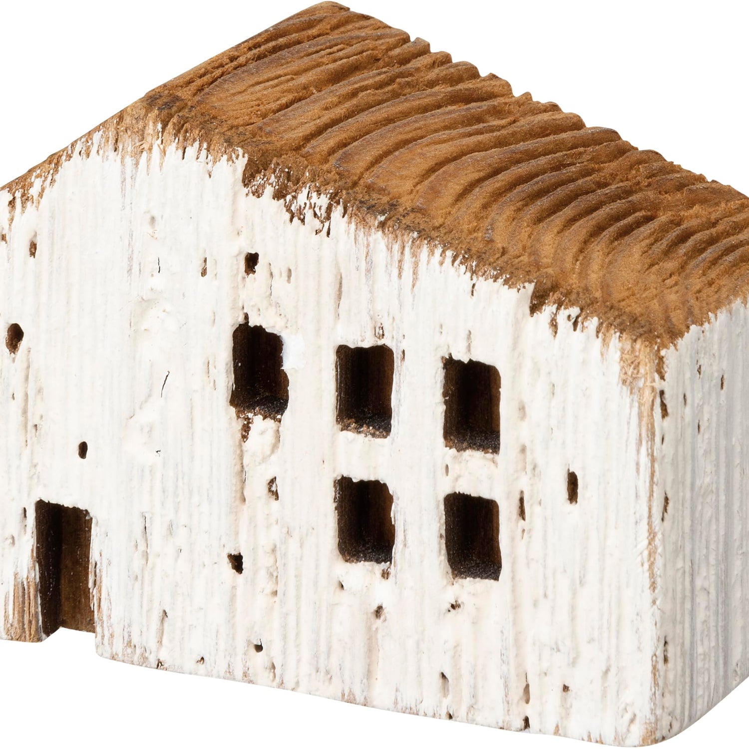 Details: A set of three wooden rustic houses including a tall white house, a small white house, and a small wooden house.