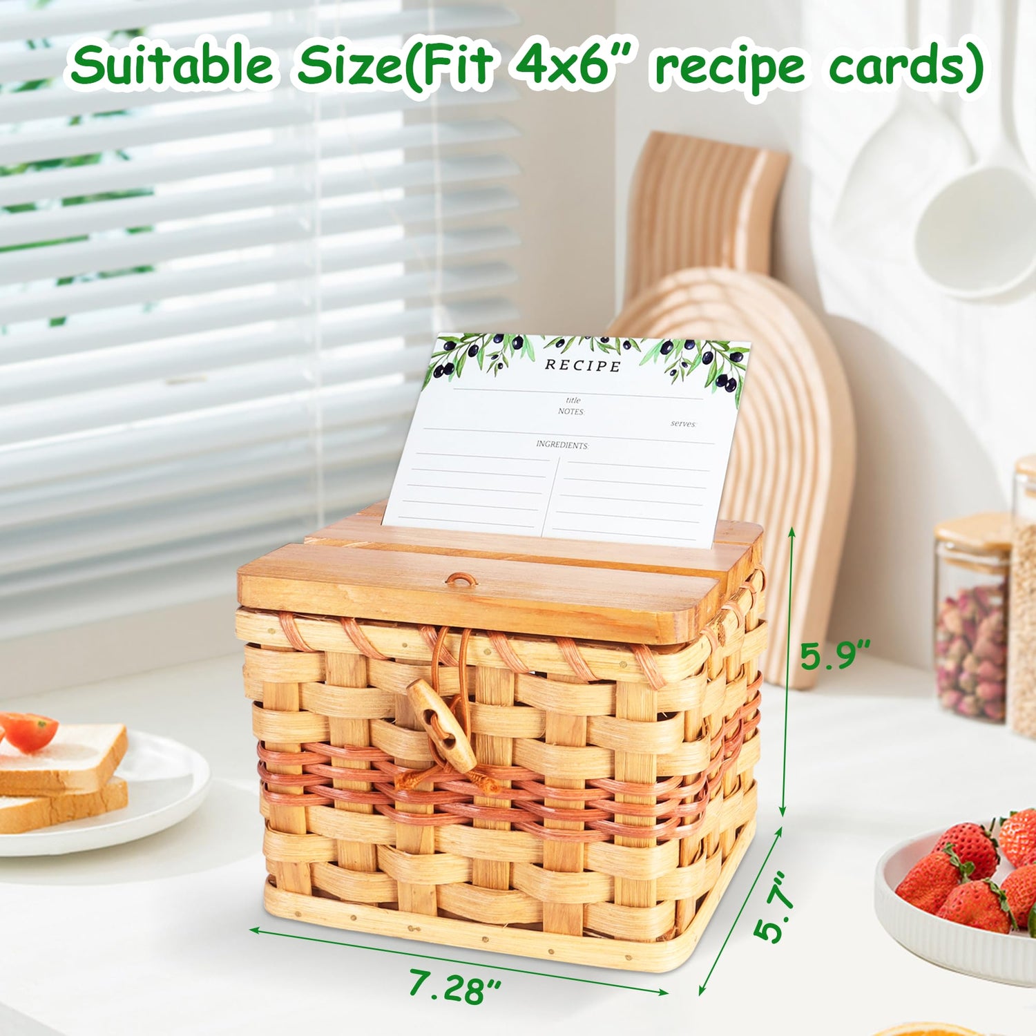- Stylish Recipe Box: Our recipe card box fboasts a farmhouse recipe box weaving bamboo exterior and a wooden lid with two grooves to conveniently hold your recipe note card or phone while cooking your favorite meal. We also designed with a secure lock so you can store your treasured recip cards freely.Compact and lightweight. A must have for any kitchen!