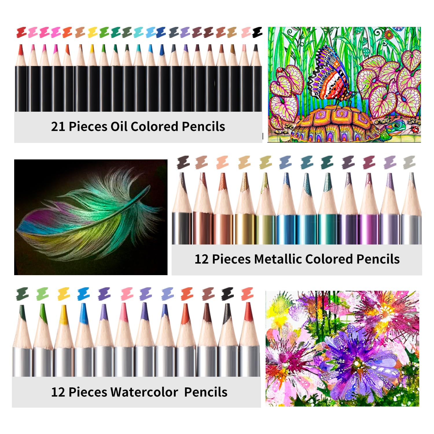 - Complete Drawing kit and Sketch Pencils Set: 81 pack Art Pencils Set along with 21 Oil Based Colored Pencils, 15 Wooden Graphite Sketching Pencils, 12 Watercolor Pencils, 12 Metallic Coloring Pencils, 3 Charcoal Pencils, Perfect for drawing, sketching, coloring, shading, layering, and blending