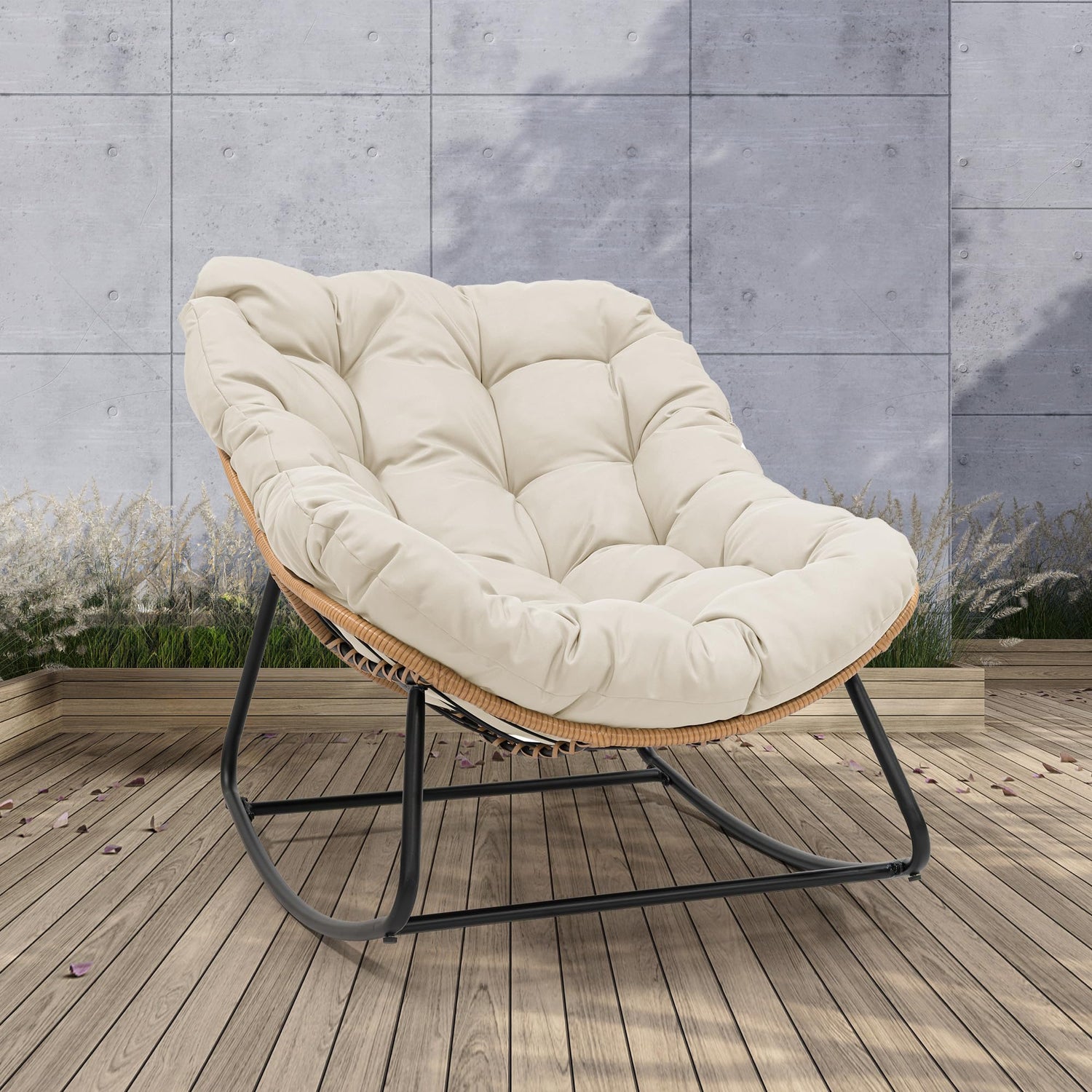 PROHIKER Outdoor Papasan Rocking Chair, Indoor Egg Rocking Chair with Thick Cushion, Oversized Wicker Rattan Patio Lounge Chairs for Backyard, Balcony, Living Room(Beige)