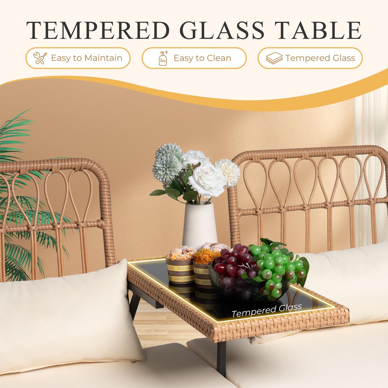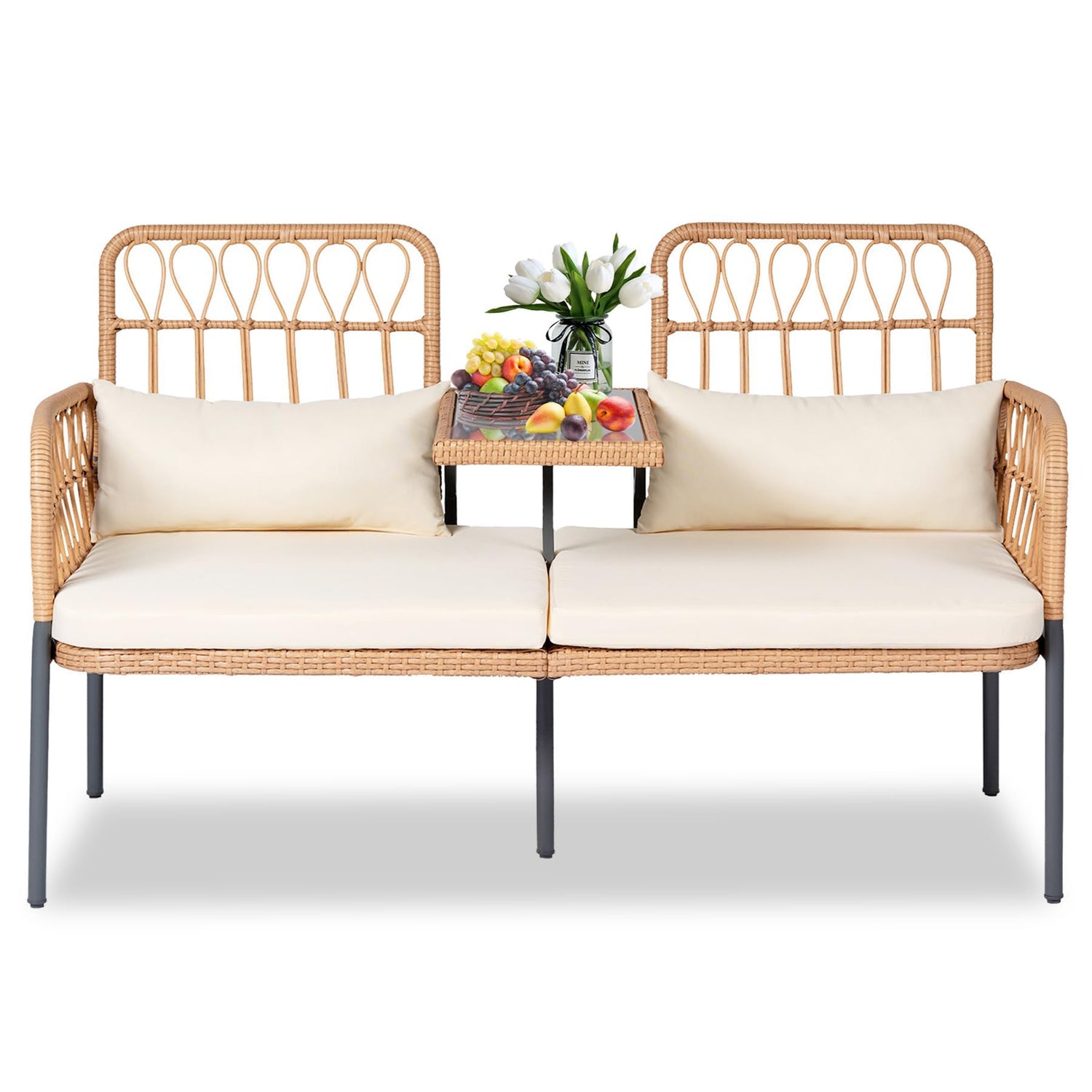 - Built-in Coffee Table: The outdoor loveseat comes with a built-in coffee table made of tempered glass, with a exquisite appearance. The size of the tabletop is 22 inches x 12 inches, providing a sufficient surface area to place drinks, snacks, or decorations, achieving a balance between practicality and space efficiency.