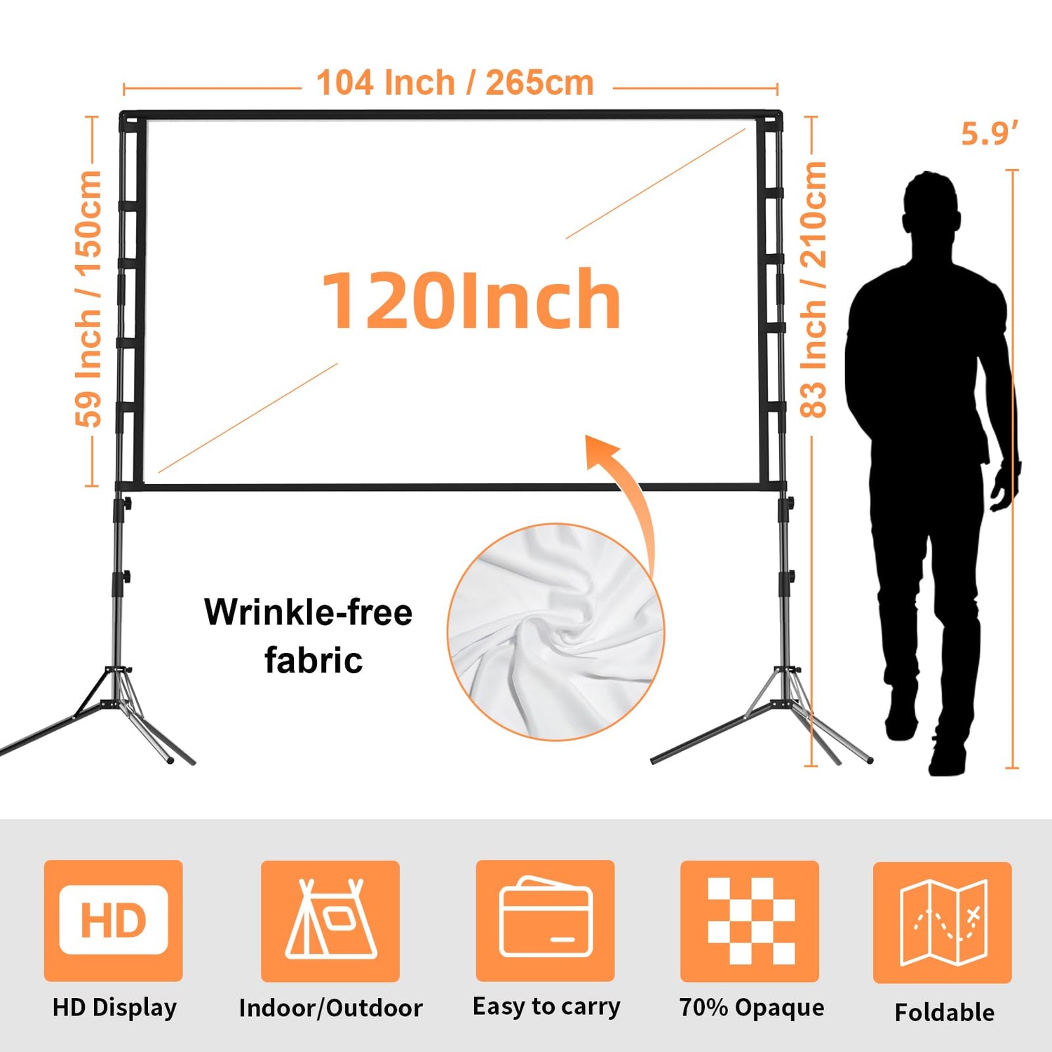 - Wrinkle-Free Movie Screen:120 inch projector screen, 16:9 format,160° Wide Viewing Angle. screen for projector is made of polyester milk silk, thicker than other ordinary screens. but not see through.The movie projector screen is foldable, washable and soft, so it is very easy to clean from stains.Thick and Wrinkle-Free design giving you more fun, even support FRONT and REAR projection.