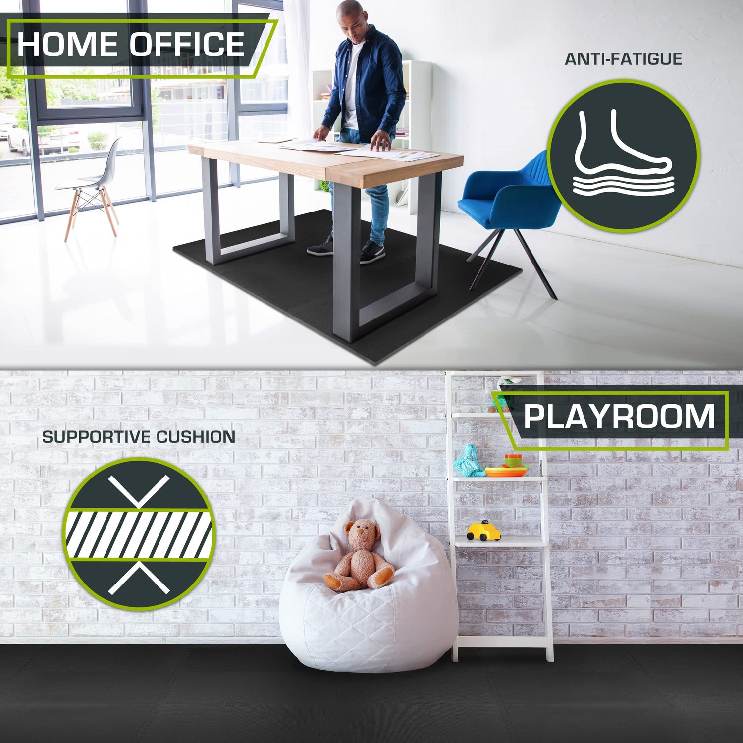 Details: Transform any space into a comfortable workout area with the ProsourceFit Exercise Puzzle Mat 3/4" or ProsourceFit Exercise Puzzle Mat 1". Six extra-thick tiles create protective flooring over wood, concrete, or carpet for workouts and gym equipment. This is the perfect solution for anyone looking for an exercise mat or multipurpose flooring thicker than 1/2" thick. Both mats have great durability, but the 1" creates more protection for heavier gym equipment and higher traffic. The textured surface has a soft feel with non-skid traction that is low maintenance. Interlocking pieces are easy to assemble, covering 96 square feet. 12 border pieces help to create a flawless finish. Built to absorb impact and provide cushion to sensitive joints while reducing noise. EVA foam contains no toxic phthalates. Use just a few tiles for smaller spaces, or purchase multiple sets for large areas. Perfect for fitness studios, home gyms, commercial use, children's play areas, gymnastics or wrestling practice, yoga and more!