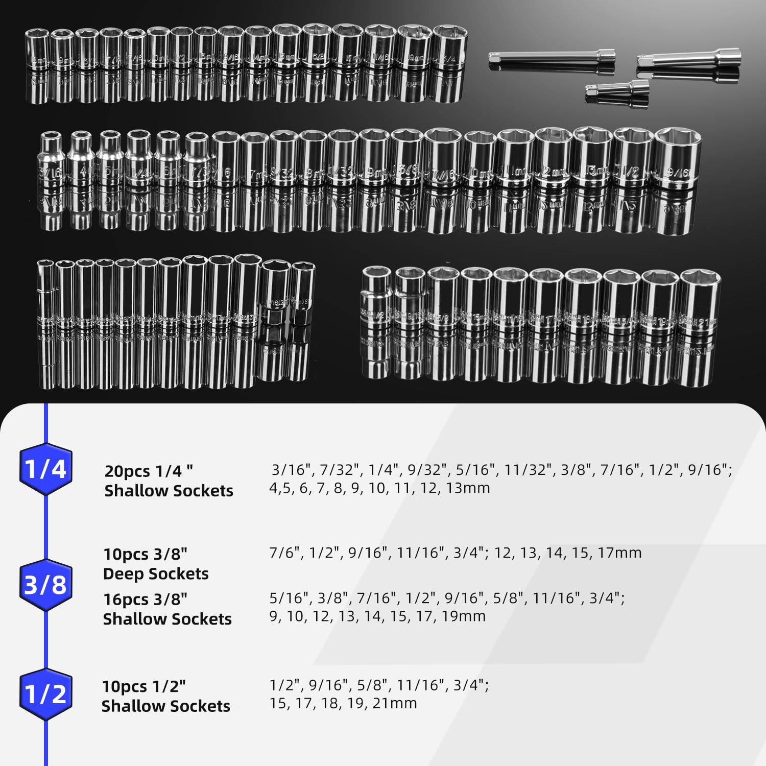 - [High Quality Tools] - All sockets and wrenches are made of high quality steel with chrome vanadium polish, that protects tools against corrosion, forged body for more torque, strength and durability.