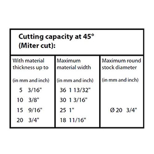 By using the fence and counter-rotating the table 2x 45 degrees, one can get the opposite angles for two equally long framing pieces by simply reversing them. Powerful, very quiet DC motor. Power transfer via belt drive. Carbide tipped saw blade 80 x 1.6 x 10mm (3 1/8" x 1/16" x 3/8"), 36 teeth. Base with round table of pressure-cast aluminum and CNC-machined guides and fittings. Other technical data: Volts 110 - 120V AC, 60Hz. Max. Power 1/4hp (200W). Speed 5,400rpm. Table area 9" x 9" (230 x 230mm). Weight 12 lb (6kg).