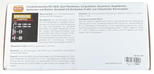- Box contents: 1x Proxxon fine lathe FD150/E with 3-jaw chuck, 1x tailstock, support, steel holder.
