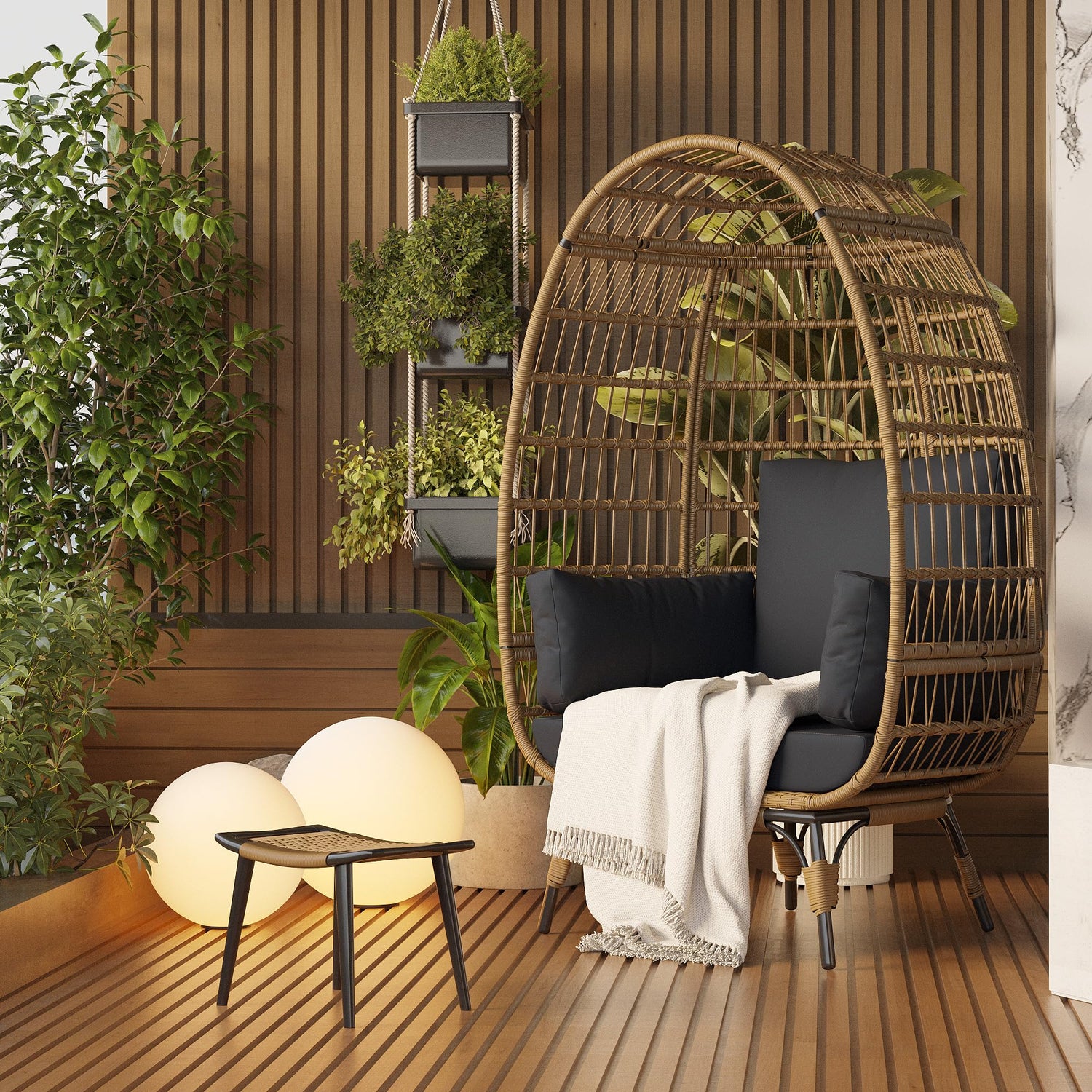 - Versatile Design: With its modern aesthetic and natural rattan finish, this spacious egg chair enhances any indoor or outdoor setting, making it a striking addition to patios, gardens, porches, or backyards.