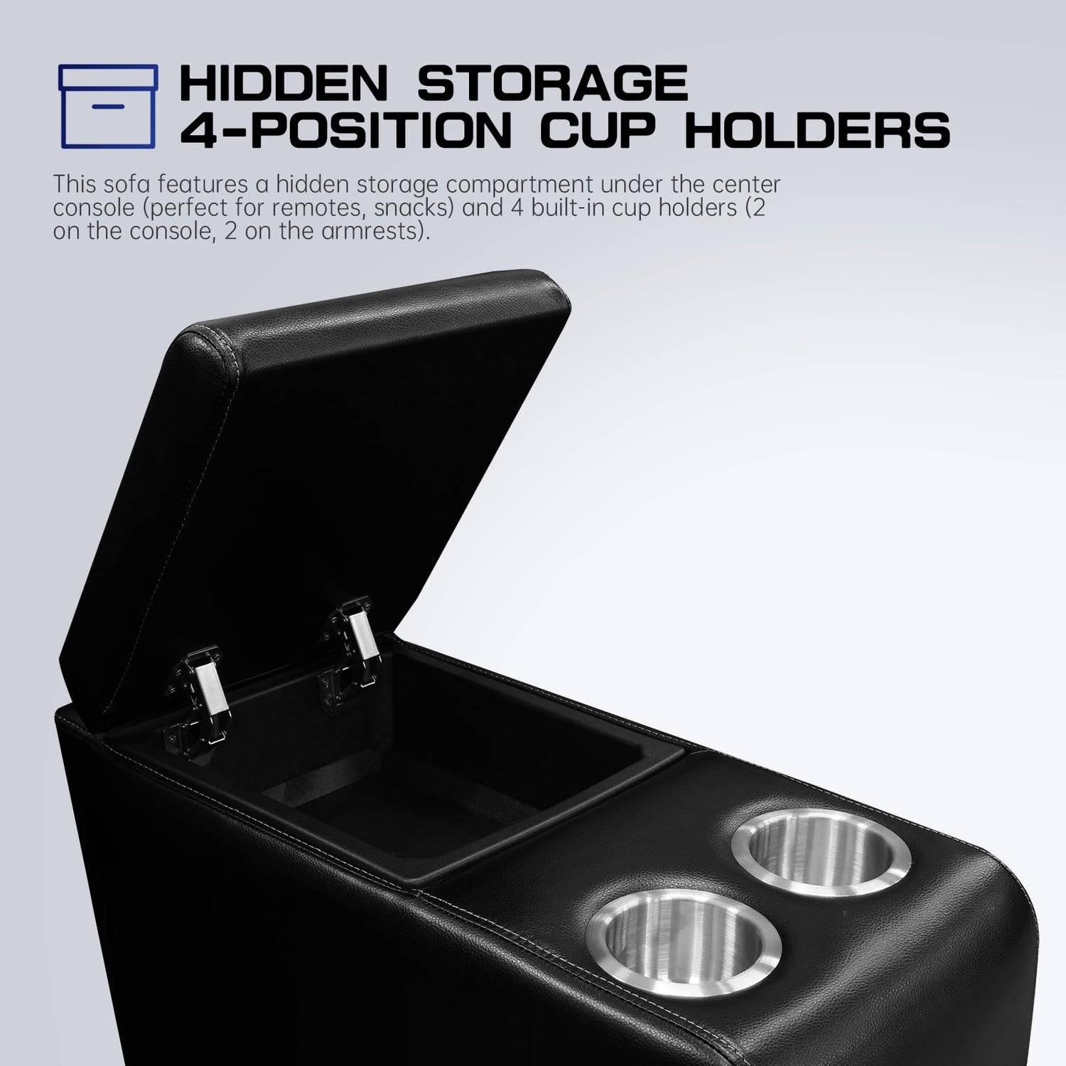 - Multiple Storage Options & Cup Holders: Thoughtfully designed with two cup holders and a hidden storage compartment beneath the center console lid, perfect for remotes, snacks, or small essentials. Additionally, each armrest is equipped with its own cup holder and built-in storage compartment, giving you even more convenient space to keep drinks and everyday items within easy reach.