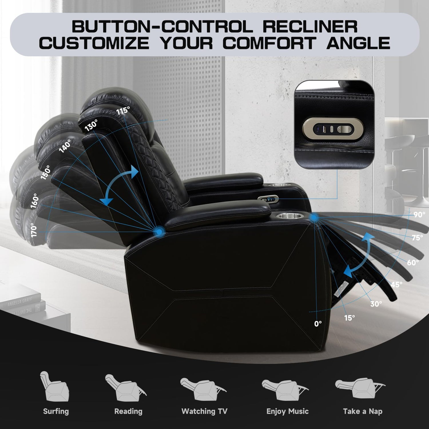 - Smooth Power Reclining with USB Charging: Features a high-speed, ultra-quiet motor for seamless reclining. Adjust the backrest between 115° to 170° to find your ideal position for watching TV, reading, or relaxing. Built-in USB port on the control panel lets you conveniently charge your phone while you lounge.