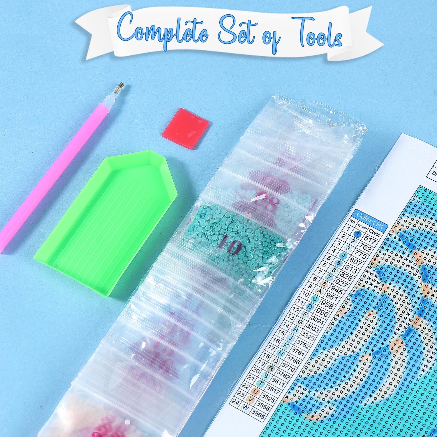 - Diamond Painting Kits: The diamond art kit contains all the tools needed. Includes: 1x high quality canvas with printed legend, 1x diamond pen, 1x diamond tray, 1x glue, enough diamonds in zipper bags and and we will give an additional 30% of diamonds