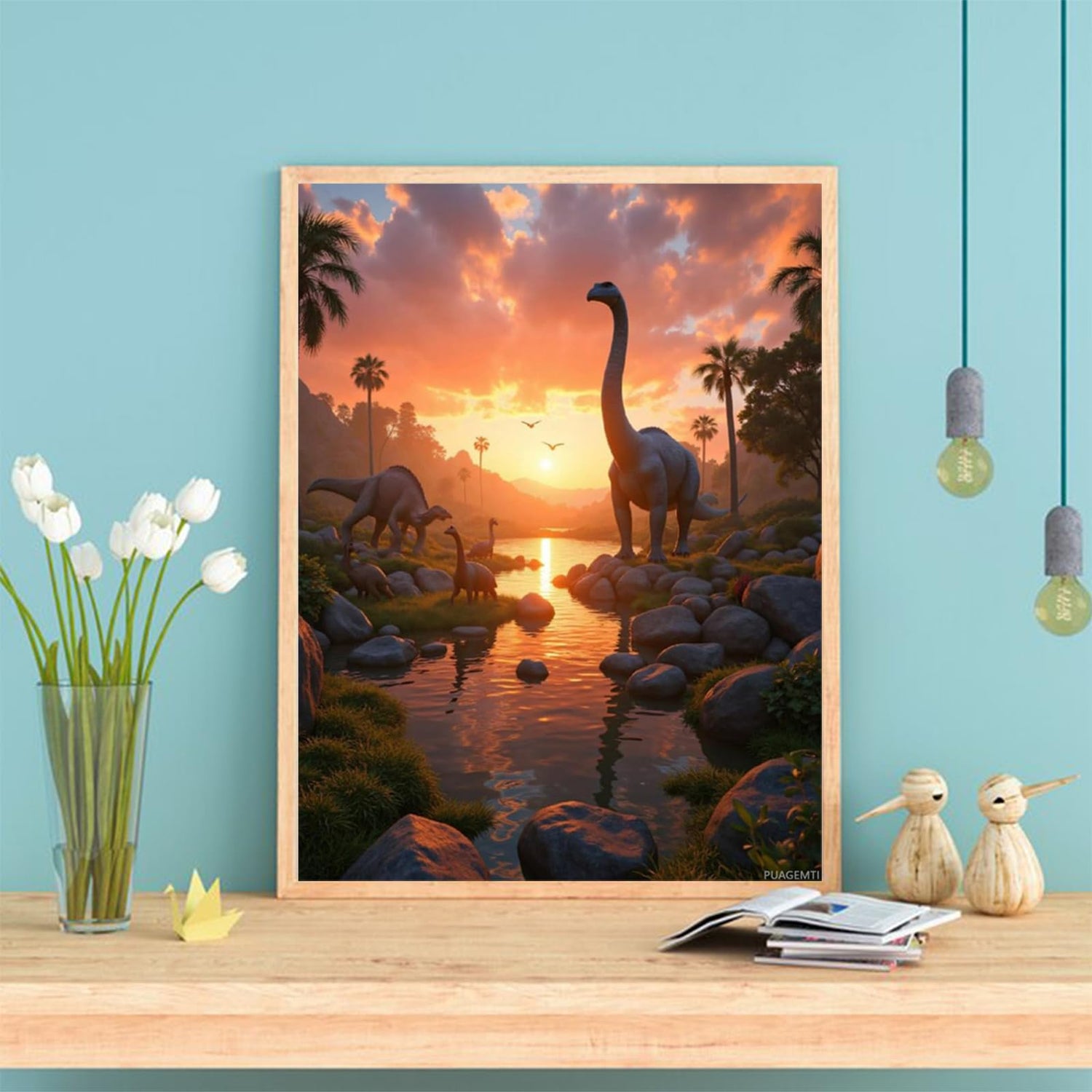 PUAGEMTI Sunset Dinosaur Valley Scene Diamond Art Kits for Adults, 5D DIY Full Drill Diamond Painting Kits for Adults Beginners, Diamond Painting Kit for Wall Home Decor (No Frame) 12x16 Inch
