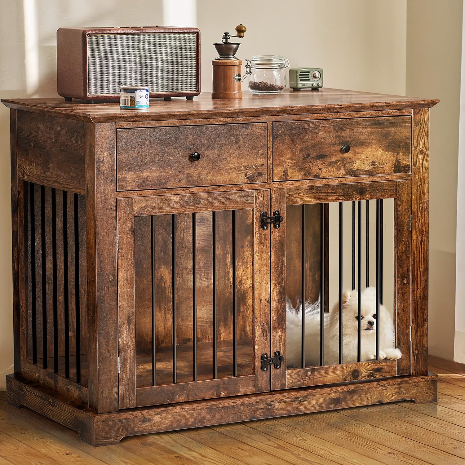 - Double Large Drawers: This decorative wood dog crate kennel has the wide desktop that you can display decorations such as plants, magazines, picture frames, night light and so on. And it equipped with 2 drawers, which provide extra storage space.Perfect for storing dog supplies (toys, leashes, etc.) or others
