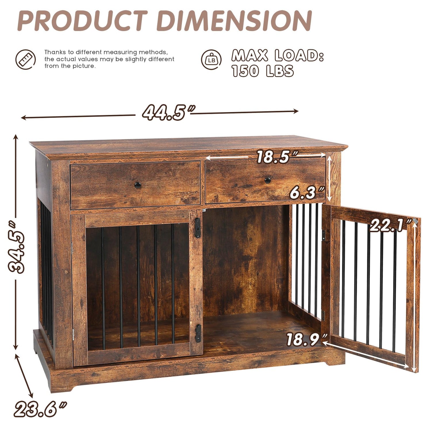 - PUKAMI Dog Crate: Overall Size: 44.5"L x 23.6"W x 34.5"H; Drawers Size: 13.4"L x 18.5"W. This furniture style dog crates can be serves as End Table,Display Stand, etc. Rustic color and appearance complement your home decor