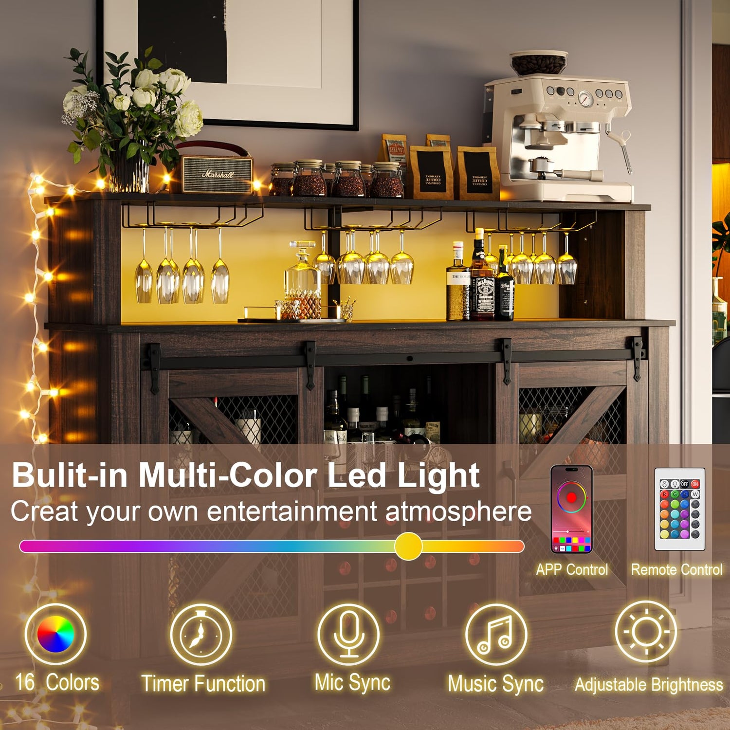 - Exquisite and Versatile Coffee Bar Cabinet: This coffee bar with led lights features classic sliding barn doors with iron mesh and black metal pulls that add to the aesthetic appeal of the cabinet. The stylish design and spacious storage space give it more possibilities. You can put it in the living room, kitchen, dining room as can be used as a coffee bar, wine cabinet, sideboard and buffet cabinet.