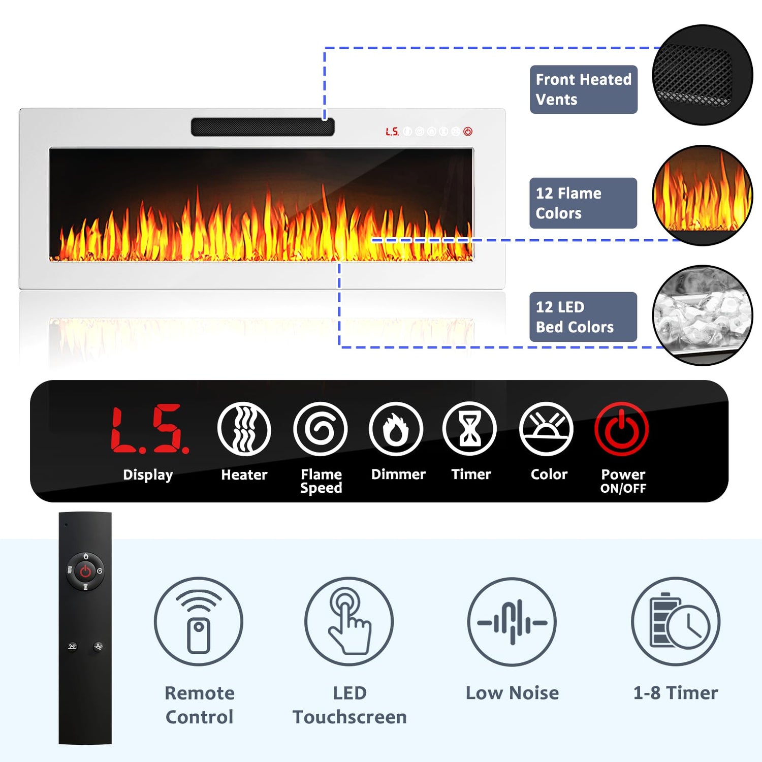 - 36 inch Eletric Fireplace: Controls 12 flame colors, and 5 brightness options via touch screen and remote control. Offers customizable temperature settings of 62°F or 82°F and a 1-8 hour timer to heat up to 400 square feet of room.