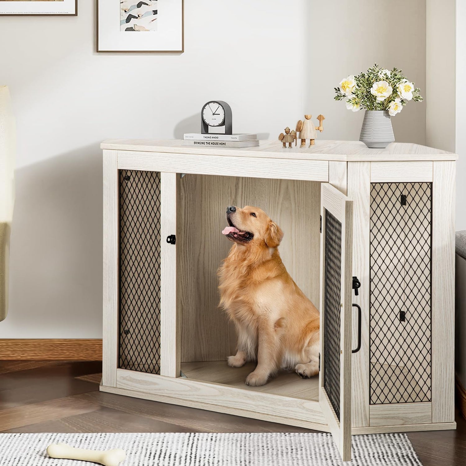 - đ¶ăStrong and durableăThe end table dog crate is made of durable MDF and heavy duty steel wire mesh, strong and durable enough to ensure a long service life, the door lock design better prevents the dog from escaping the crate. With plenty of space inside, you can place a soft cushion inside to provide a large and comfortable resting space for your pet.The space in the dog crate is suitable for dogs up to 80 pounds.