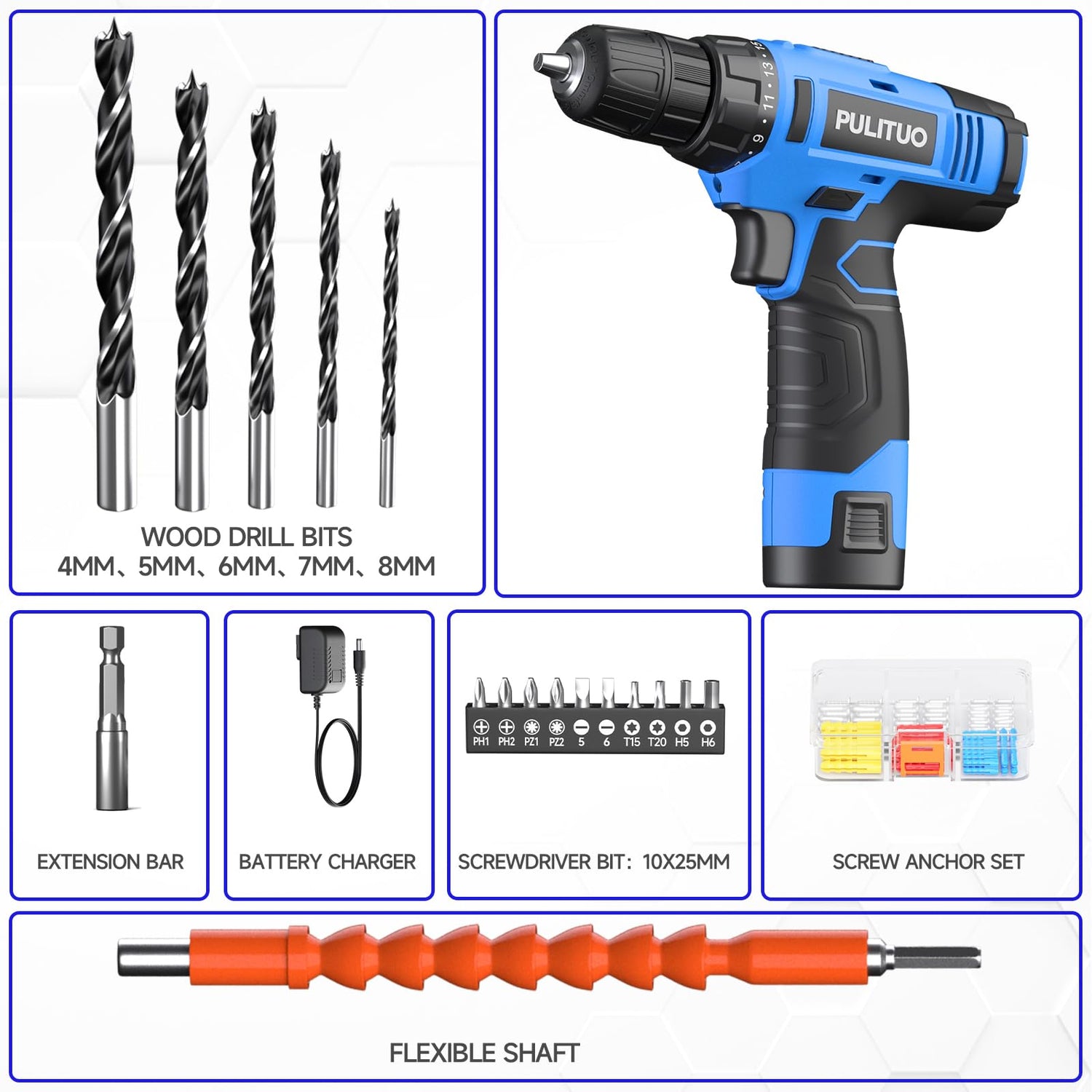 PULITUO 12V Blue Cordless Drill Set Power Drill Kit with Battery and Charger,electric drill home improvement,3/8-Inch Keyless Chuck,Built-in LED,21+1 Torque Setting small drill