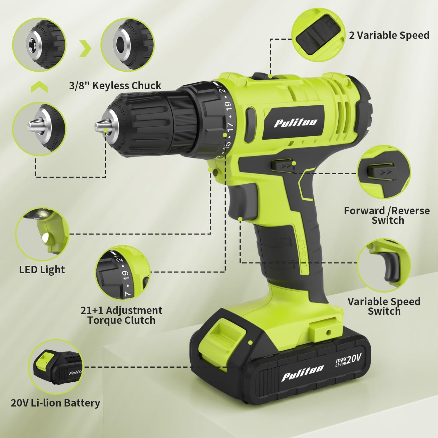 PULITUO'S 20V Cordless Drill/Driver, Electric Screwdriver - 2 Batteries, 30Nm, 21+1 Torque, 2 Speed, Keyless 3/8" Chase Drill with LED Light, Kit for Home (Green)