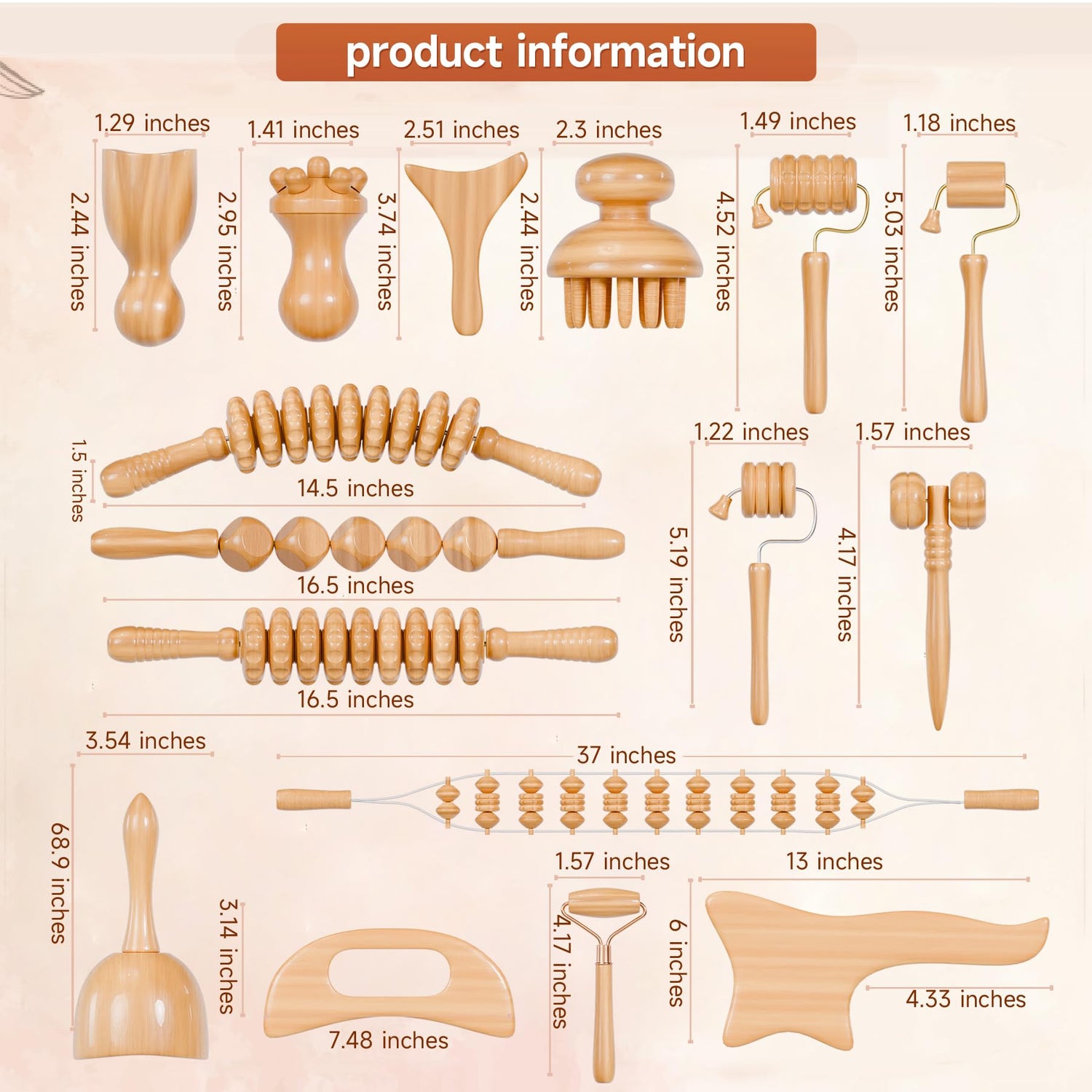 - 16-in-1 Maderoterapia Kit: you will get 16 pack wood therapy massage tools, 1 x cube massager, 1 x wood therapy roller, 1 x wood back massage roller, 2 x wood massager, 2 x wooden gua sha massager, 2 x wood massage cup, 3 x drainage massager, 4 x wood facial roller therapy tool.
