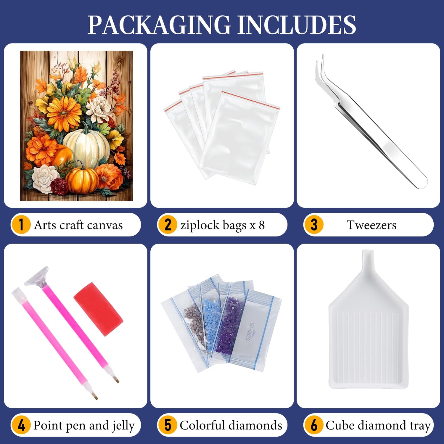 - Pumpkin Diamond Painting Kits: Diamond painting accessories and tools comes with everything you need! Including 1x waterproof painting canvas, 1x trays, 1x wax, 8x self-sealing bags, 2x point diamond pen, 1x tweezers, and enough diamond art beads. For each diamond art kit we'll provide 30% more diamond beads than needed