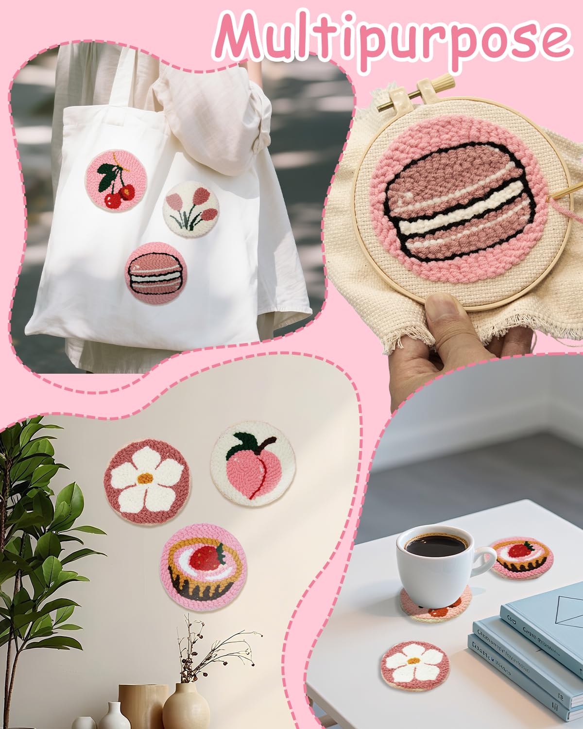 • COMPLETE STARTER KIT: Includes punch needle tool, embroidery hoop, fabric, yarn, and detailed instructions for creating beautiful coaster designs