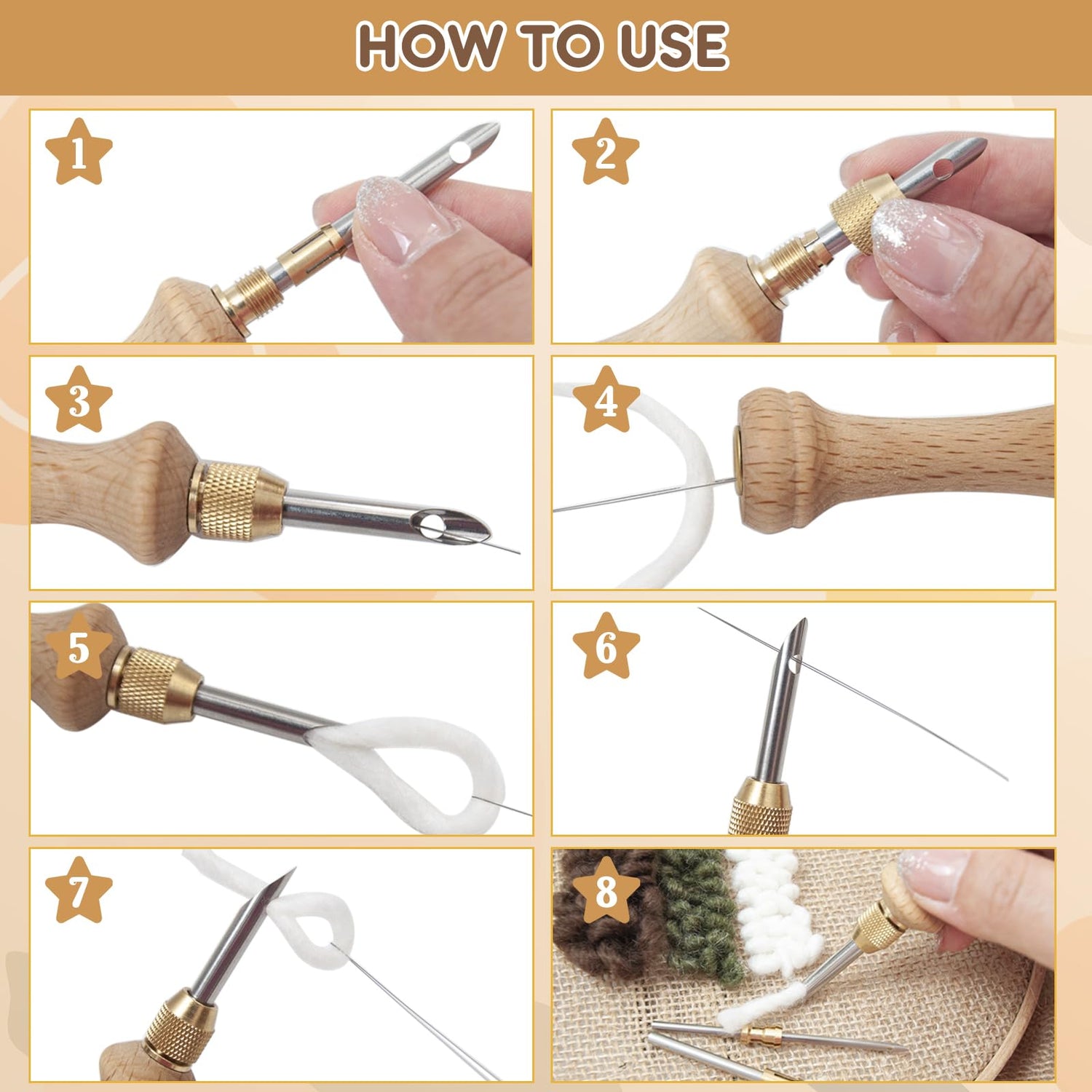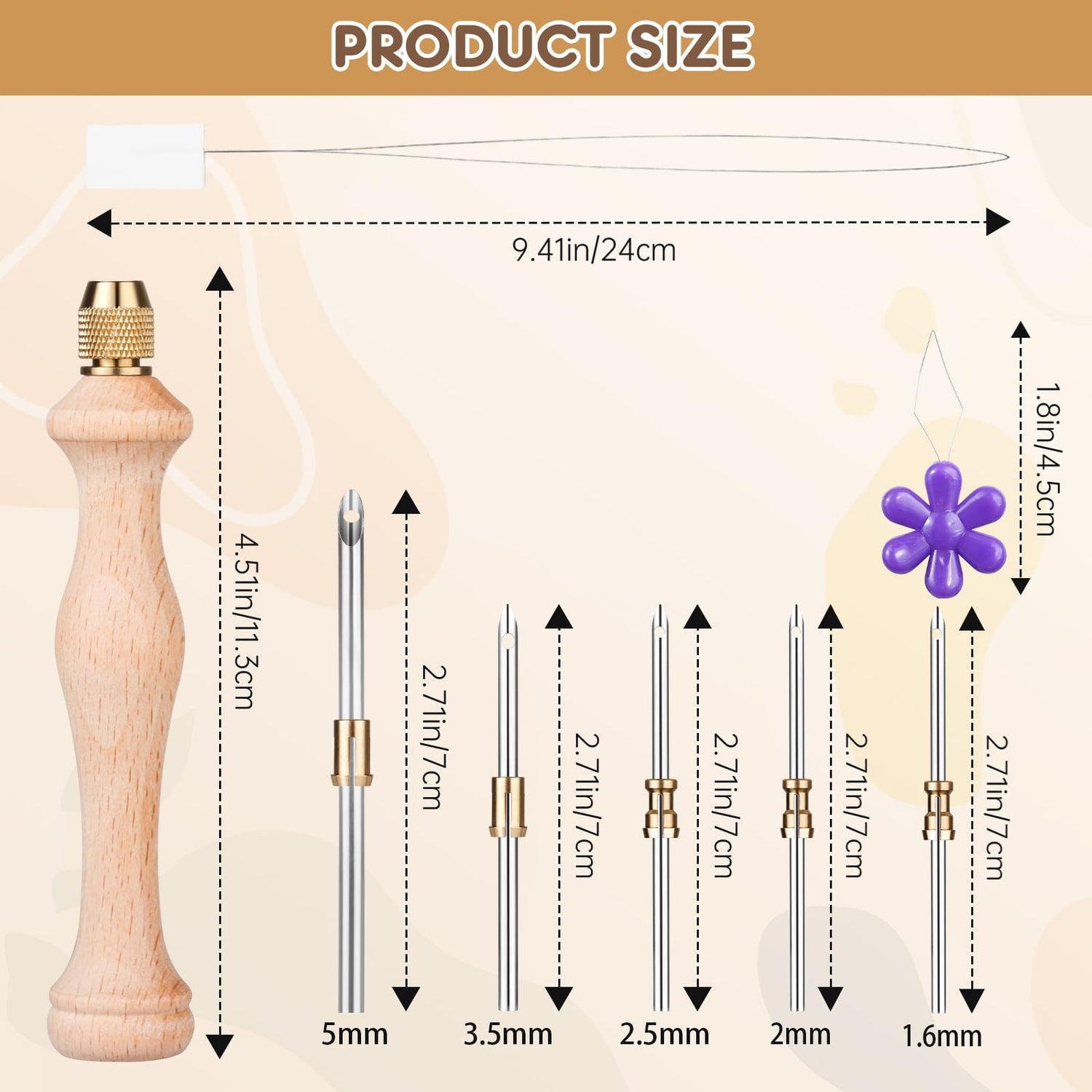 • 【Package Include】 You will receive 1pcs wooden punch needle with 5pcs adjustable needles, 2pcs threaders ,1pcs scissors 1pcs instructions and 1pcs storage box.The diameter of the needle is 5mm, 3.5mm,2.5mm,2mm,1.6mm.Combined with different needle heights, you can experience a variety of creative punch needle.
