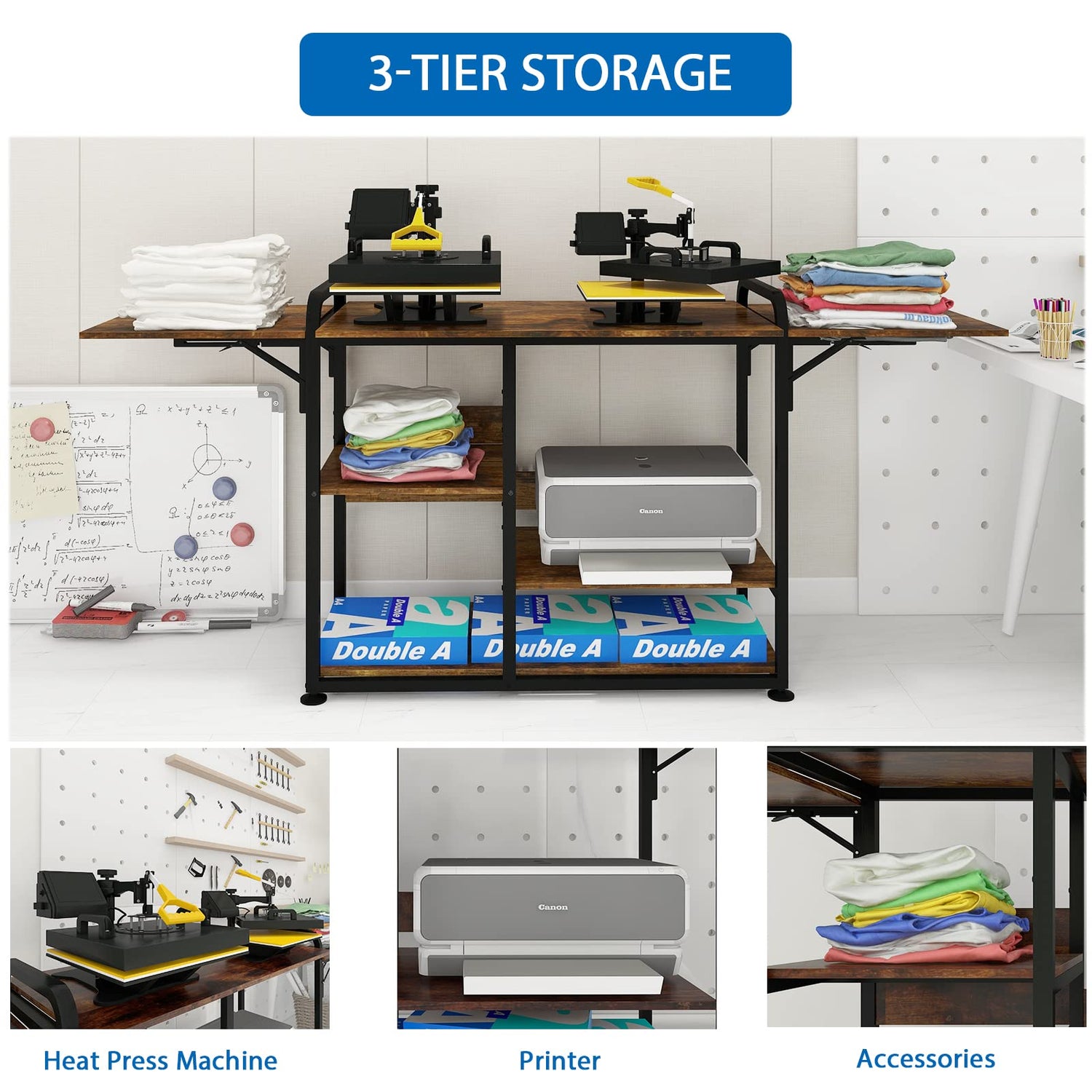 PUNCIA Large 3 Tier DIY Heat Transfer Press Machine Stands Heavy Duty Workbench with Folding Working Table for Sublimation Transfer Machine Metal Shelf Storage Organization