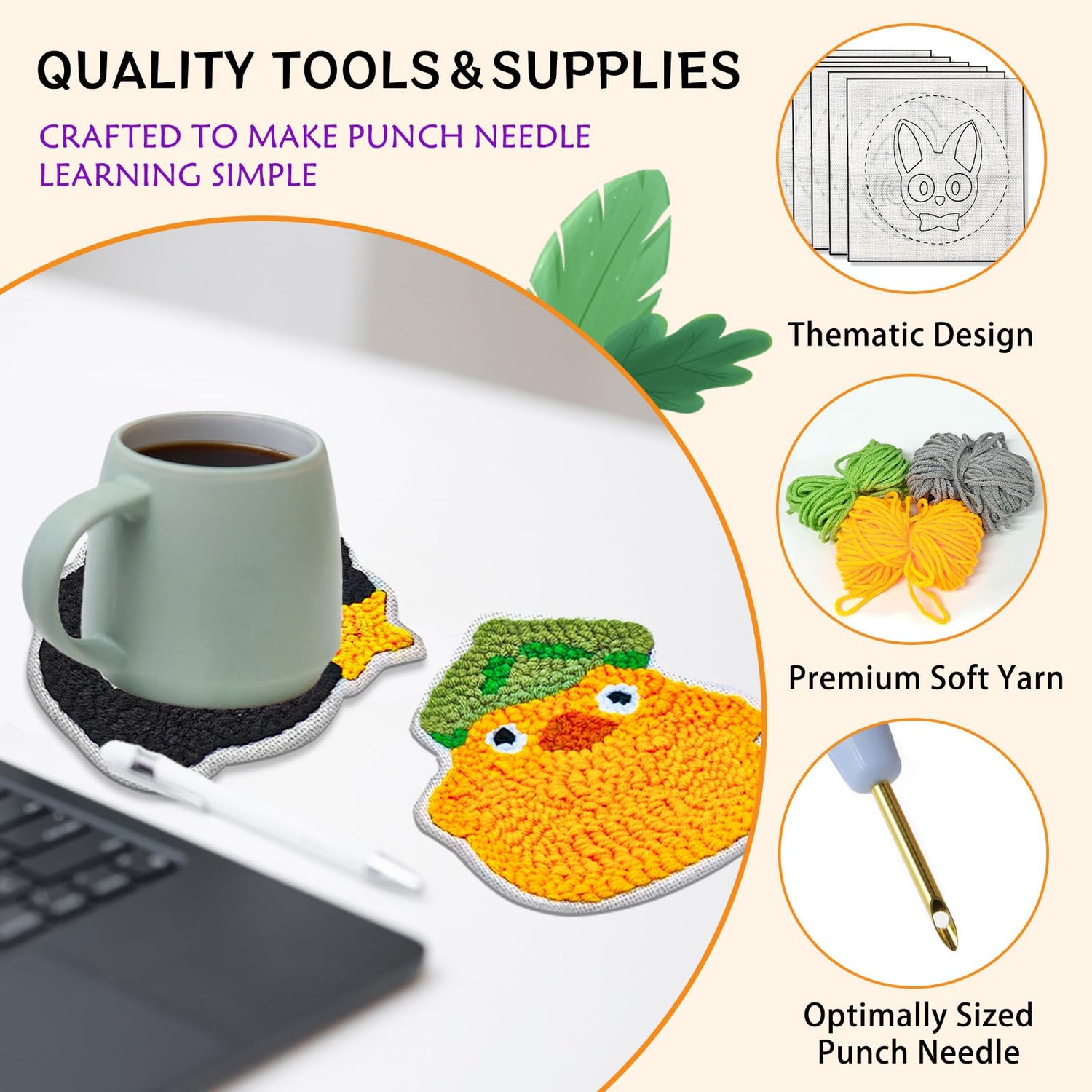 PUNICA Punch Needle Kit for Beginners, Kids & Adults Coaster Set of 6, Easy DIY Embroidery Set Starter Craft Gift with Cute Cartoon Decoration