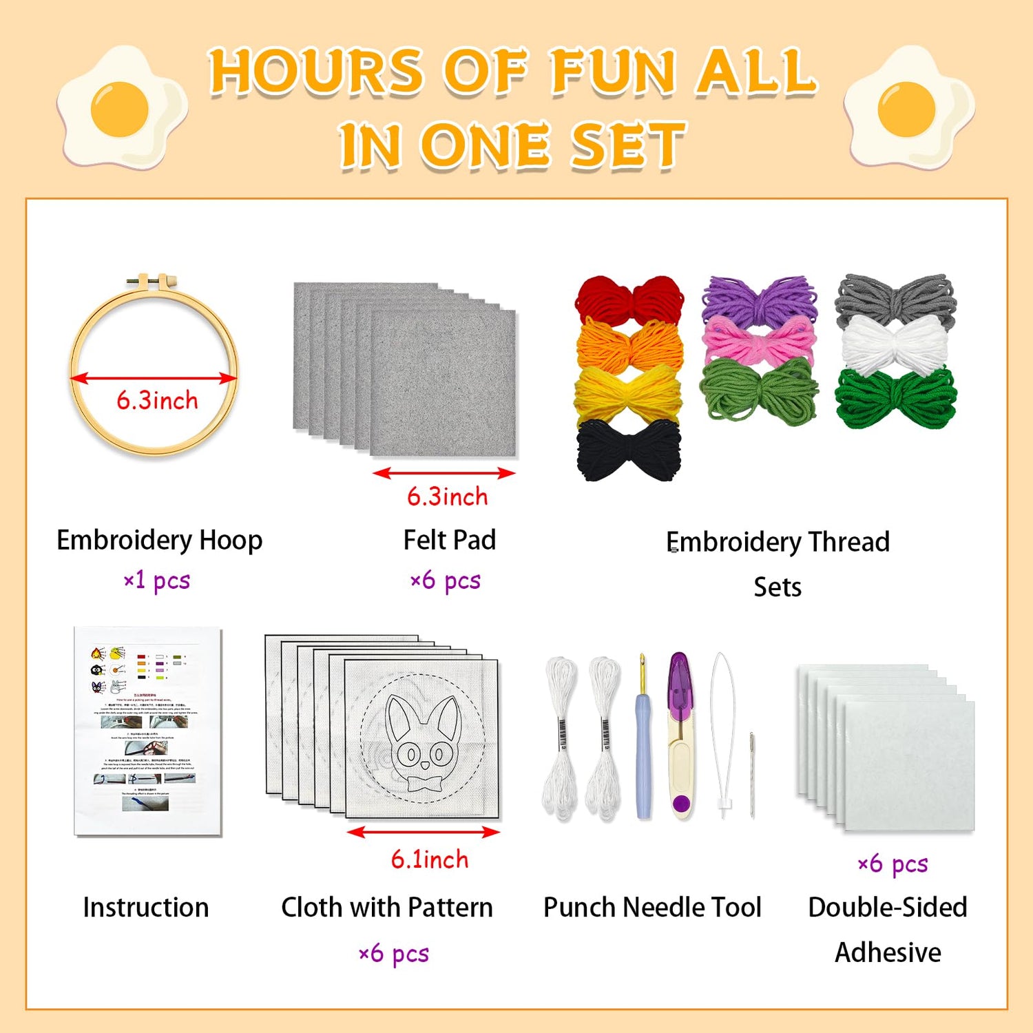 - Complete Beginner-Friendly Set: Designed especially for beginners, this punch needle kit includes everything you need — 1 embroidery hoop, punch needle tool, 6 pre-printed cartoon cloths, colorful yarn set, embroidery threads, needles, double-sided adhesive sheets, and detailed instructions. Start your DIY punch needle journey with ease!