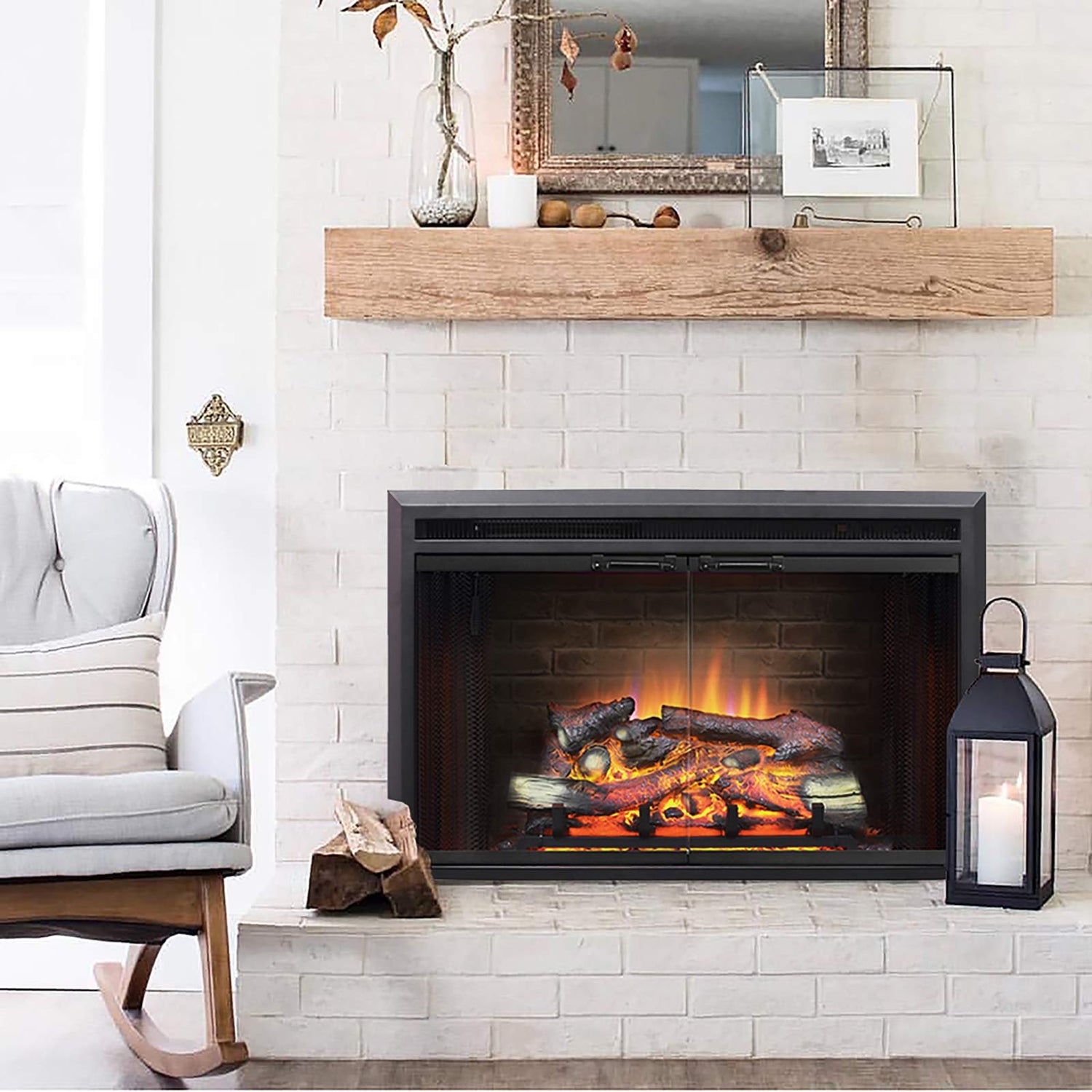 - Life-like resin log which is 11 13/16" high sitting on the grate above ember bed, that's just what a wood burning fireplace looks like. Traditional antique design with three-sided interior brick wall, glass door and mesh screen makes it more realistic but without the hassle of cleaning dust or ashes