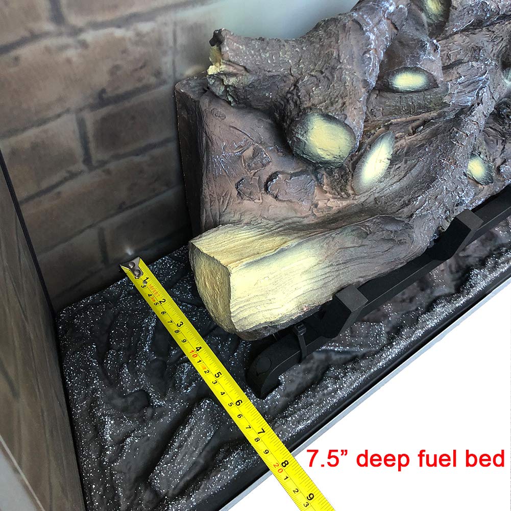 - Life-like resin log which is 11 13/16" high sitting on the grate above ember bed, that's just what a wood burning fireplace looks like. Traditional antique design with three-sided interior brick wall, glass door and mesh screen makes it more realistic but without the hassle of cleaning dust or ashes