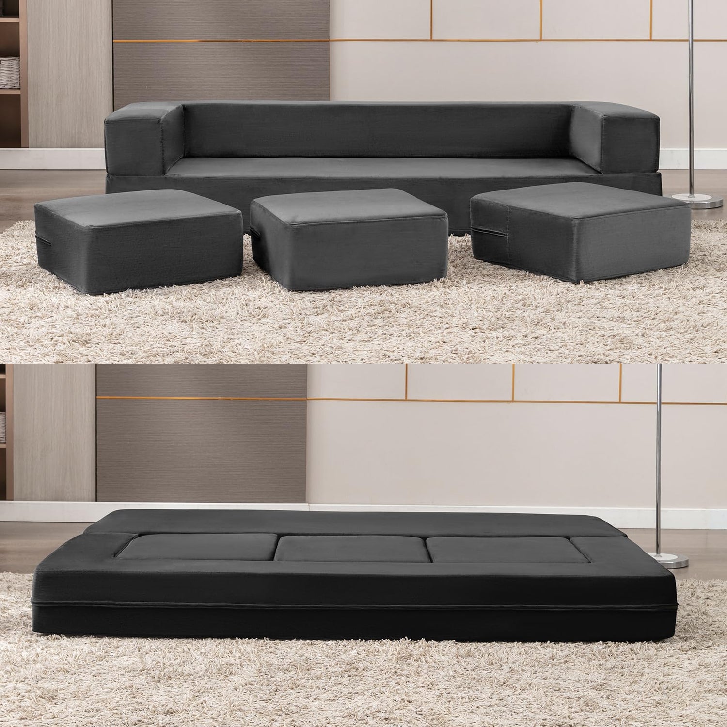 PUREMIND 10 Inch Folding Sofa Bed, Velvet Convertible Floor Sleeper Sofa with 3 Ottomans, Upholstered 2-in-1 Fold Out Couch Bed Queen Size Guest Bed Foldable Mattress for Living Room, Office