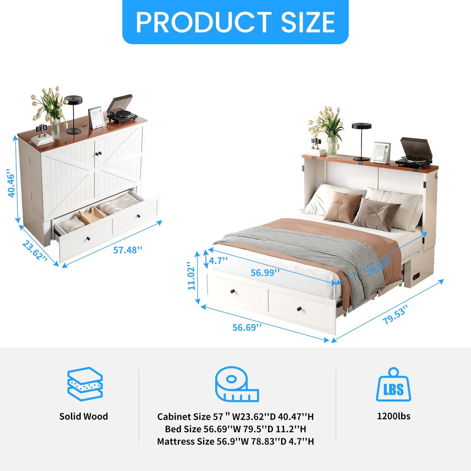 - 【Multifunctional Wall Bed & Storage】Elegantly designed as a complete furniture solution, this Murphy bed is housed in a stylish cabinet with a spacious drawer and built-in charging station. It effortlessly serves as a TV stand, sofa backdrop, or extra storage, making it the perfect space-saving addition for studios, guest rooms, or apartments. Available in both Full and Queen sizes to match your space needs.