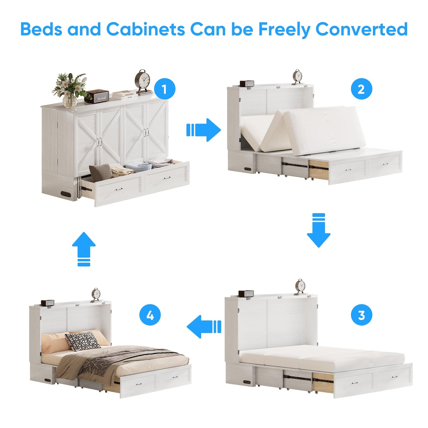 PUREMIND Queen Murphy Bed Cabinet with Mattress Included, Bedroom Cabinet Beds with USB Charging Station, Murphy Chest Bed with Storage Drawers, Horizontal Wallbed for Guest Room White