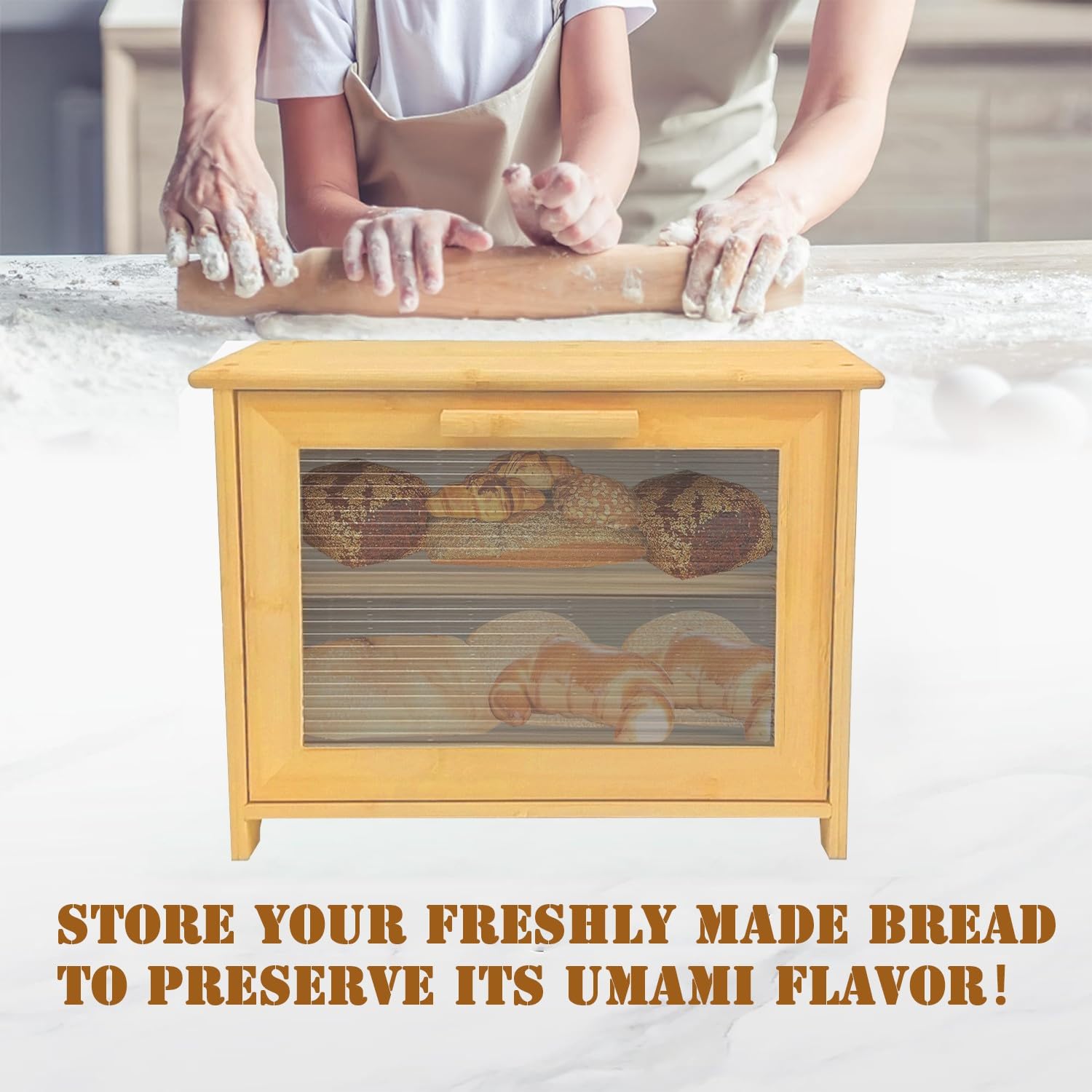 - Natural Bread Bin construction: Crafted from 100% high-quality natural wooden box, our large bread box is exquisite, healthy, and durable. Its smooth surface treatment and wave-like acrylic window add a stylish touch, making it not only an excellent decoration for bread box for kitchen countertop but also a perfect gift for breadbox for homemade bread enthusiasts.