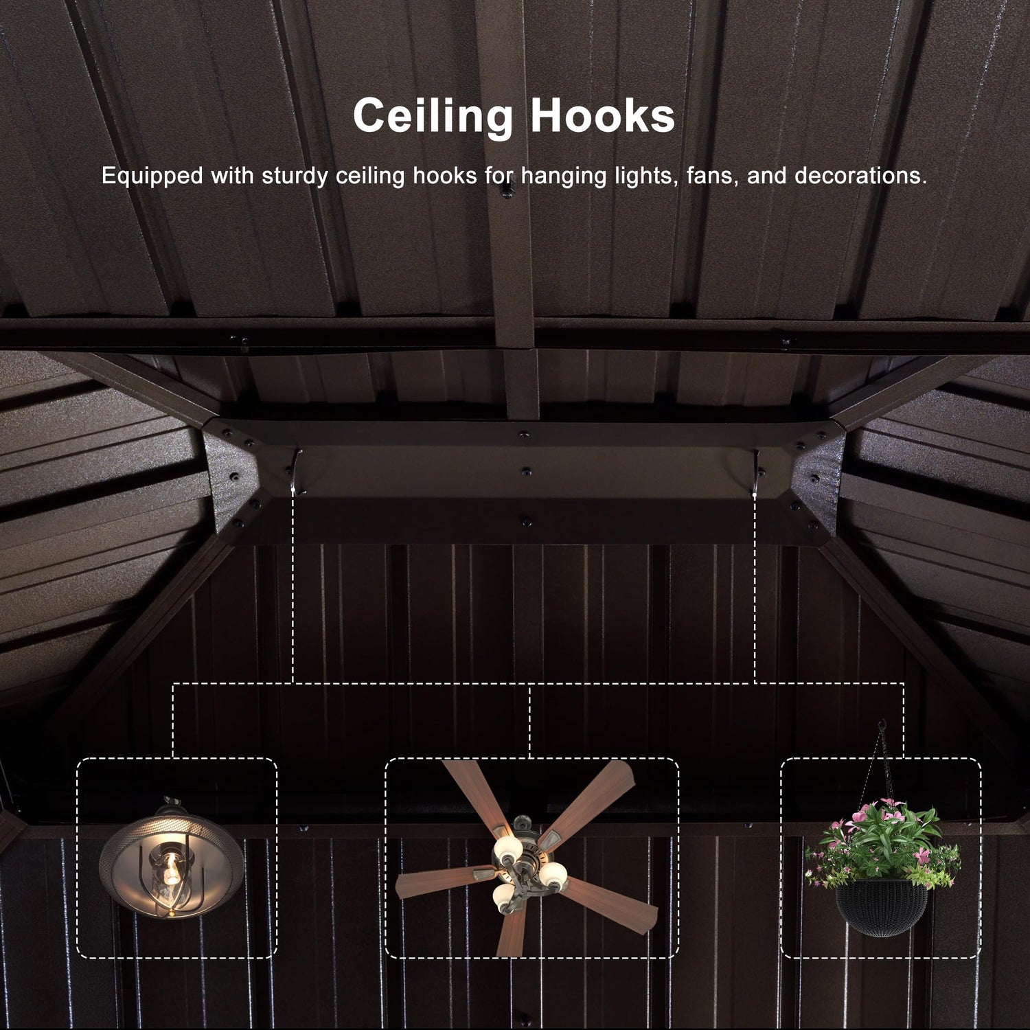 - Dual-layer galvanized steel roof is weather resistant, can withstand 2,500 LBS of snow. The inner top is surrounded by netting to keep air circulating. 2 hooks on the top can hang things up to 20 lbs.