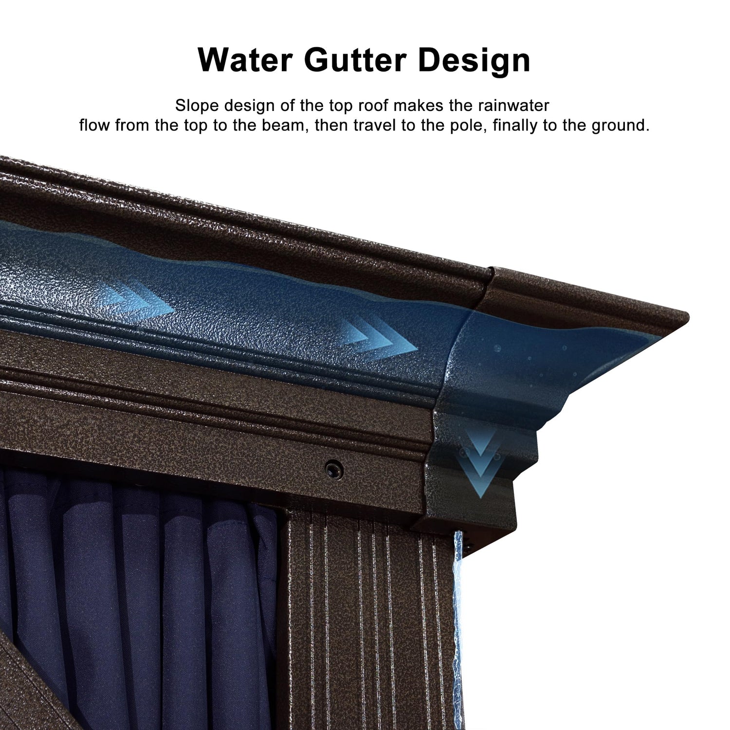 Details: This premannent gazebo will give your day a lift as you get up in the morning,sit down to breathe fresh air and enjoy the scenery. Navy blue curtains tied to the sides of pillars and occasionally festive decorations that make this gazebo the centerpiece of your patio décor.Stable four-post and sidewalks create a comfortable and independent space.The processed galvanized steel double-layer roof is not easy to accumulate dust, does not fade or peel off, and it remains as new when placed outdoors for a long time. The pillar and the roof are joined with enough screws and reinforced to prevent from shaking, ensuring your safety. The curtains are made of yarn-dyed fabrics, which protect you from the rain and the slanting sun.The drainage ditch design prevents rainwater from gathering in the middle of the eaves, reducing the phenomenon of potholes on the ground caused by water droplets.Just follow the steps of manual to install, the roof will not leak rain. In winter,what a wonderful thing to have a fire, chat with friends and snack in it. In the hot and humid rainy season, you can eat fruits while breathe fresh air. It will be shipped in the boxs right to your front door If you choose this durable pavilion.