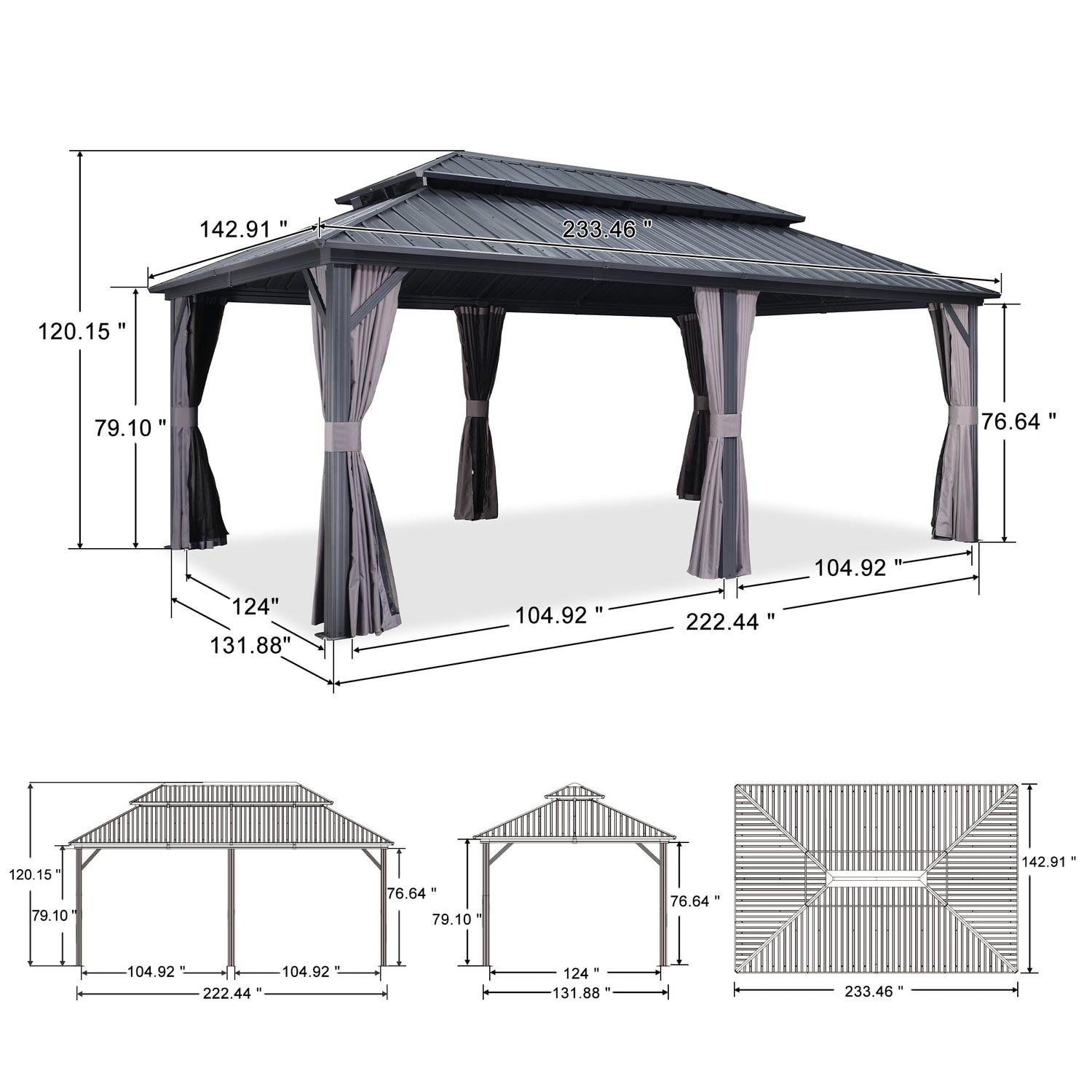 PURPLE LEAF 12' X 20' Patio Hardtop Gazebo Outdoor Pavilion Gazebo with Galvanized Steel Double Roof for Patio Lawn Garden Aluminum Gazebo with Mosquito Nets and Curtains Grey