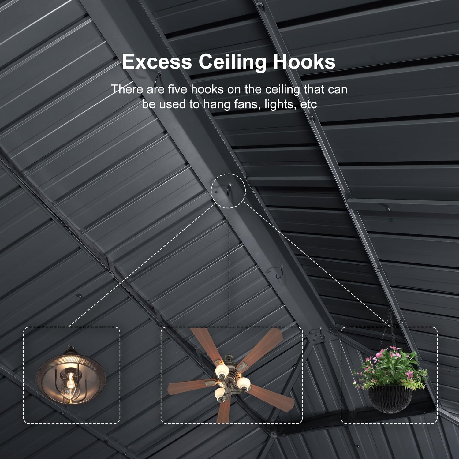 - 【Ceiling Hooks】Comes with built-in, high-quality, sturdy ceiling hooks designed to easily hang your favorite chandelier or other decorative items. Outdoor gazebo can easily be transformed into a comfortable and light-filled gathering place to spend precious time with family and friends.