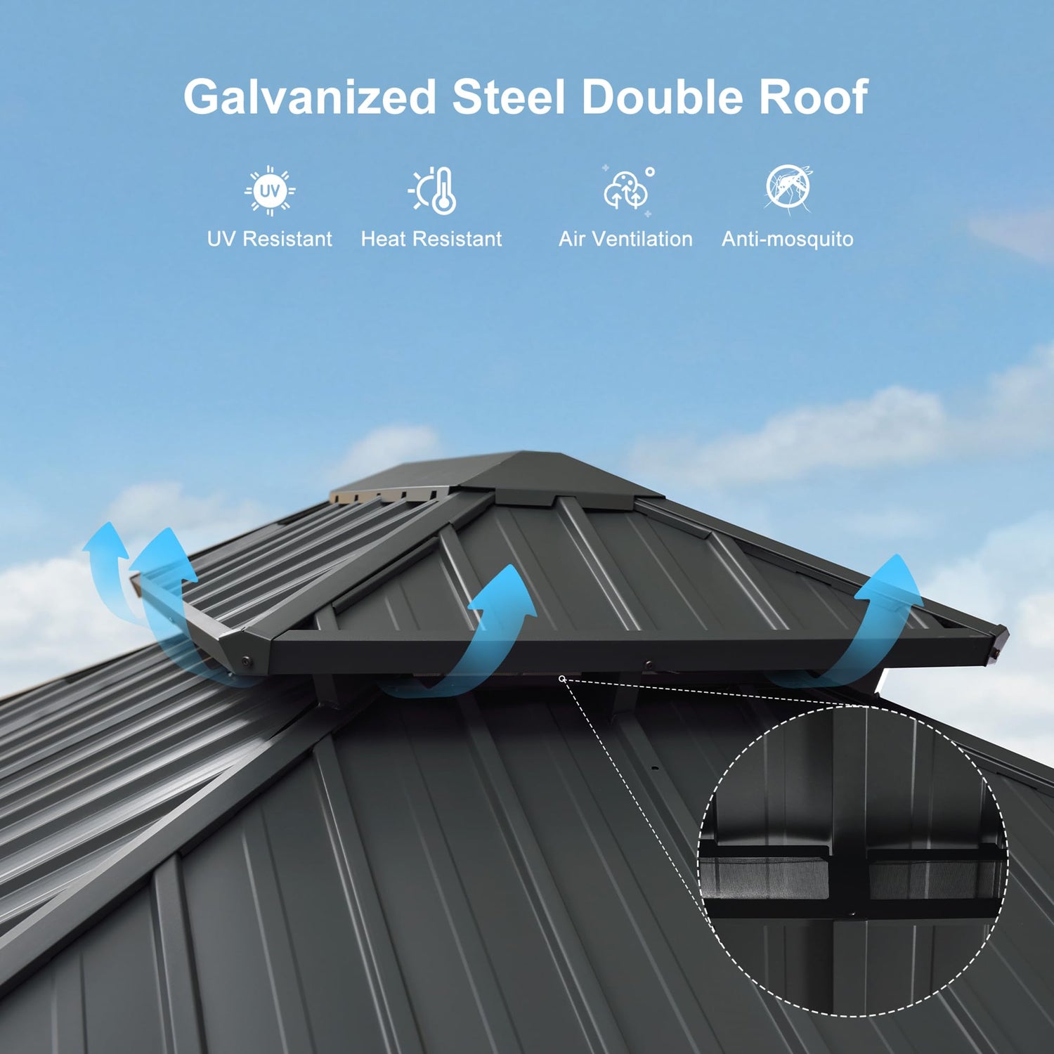 • Galvanized Steel Double Roof: The roof of this outdoor sunroom is made of galvanized steel, which can effectively prevent harmful UV rays and rust. Besides, the double-layer design can bring better heat insulation and ventilation, enough to withstand all kinds of weather.