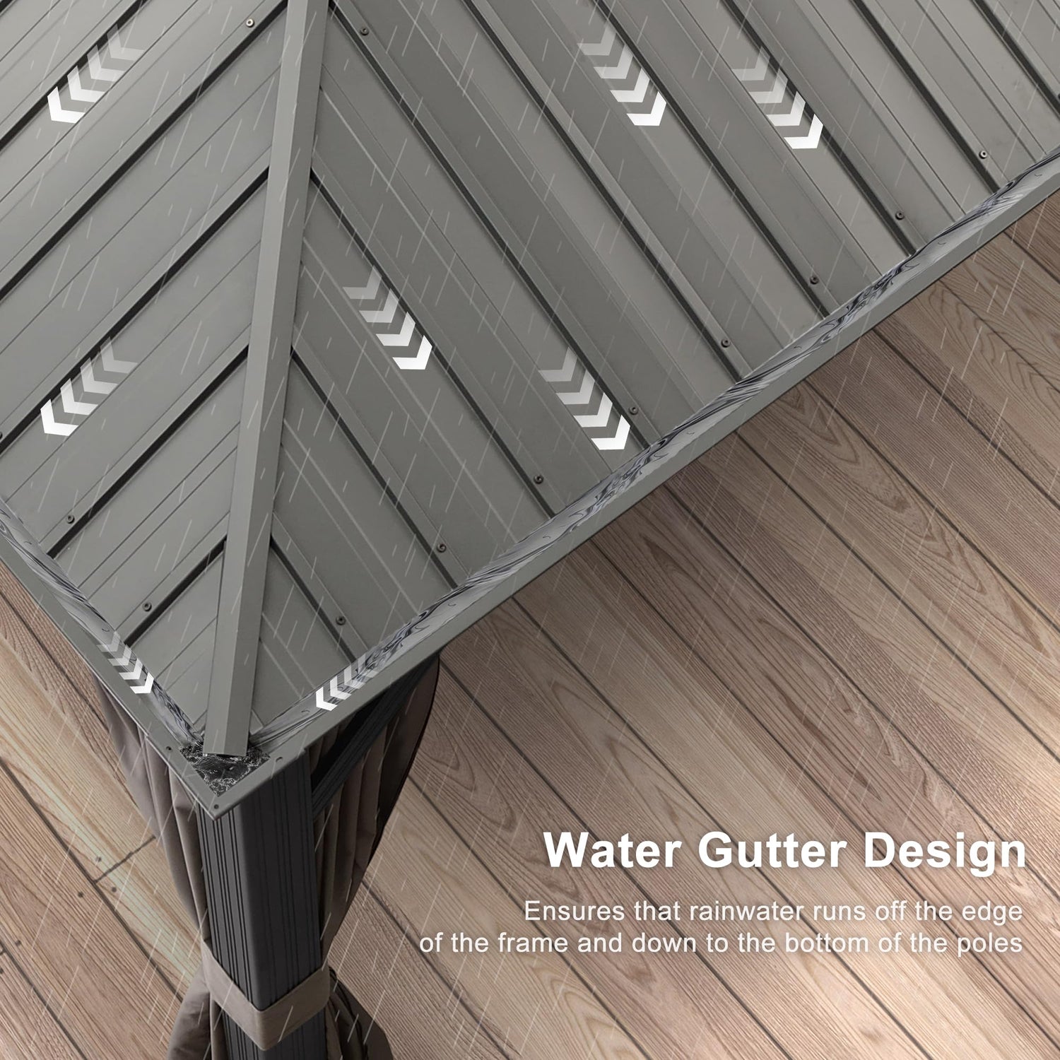 - Drainage System Design: Reasonably sloped roof designed to allow water to drain quickly, and the water gutter design of this hardtop gazebo ensures rainwater flows out of the edges of the frame and poles.