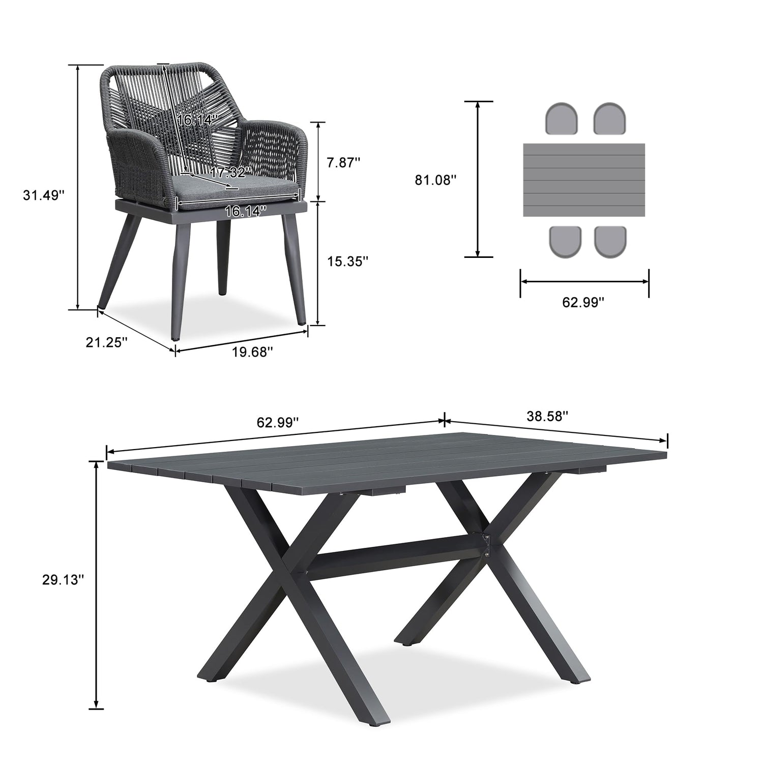 - All-weather Patio Furniture Set: Includes 1 rectangular grey table (63"L x 38.58"W x 29.13"H) and 4 grey chairs (19.69"W x 21.26"D x 31.50"H, 15.35"SH).