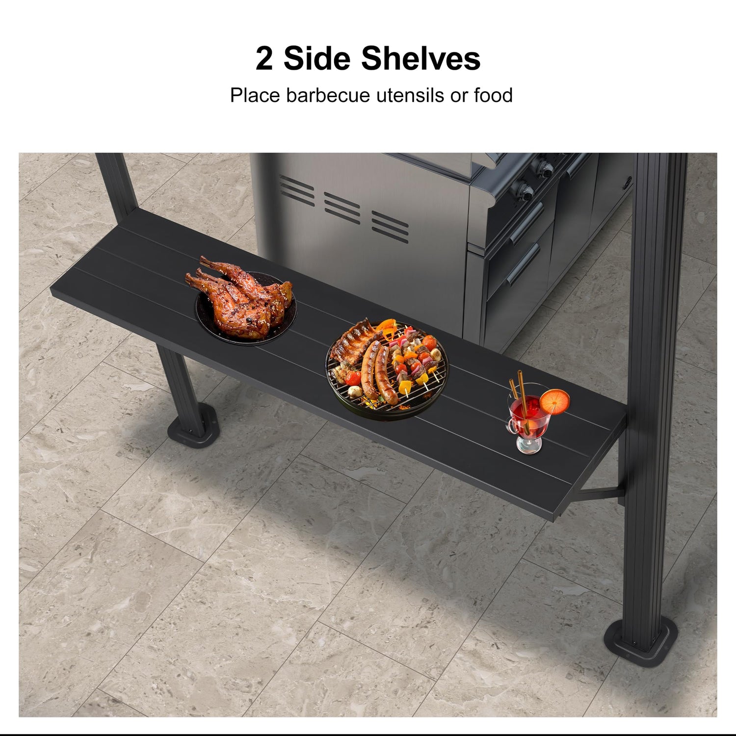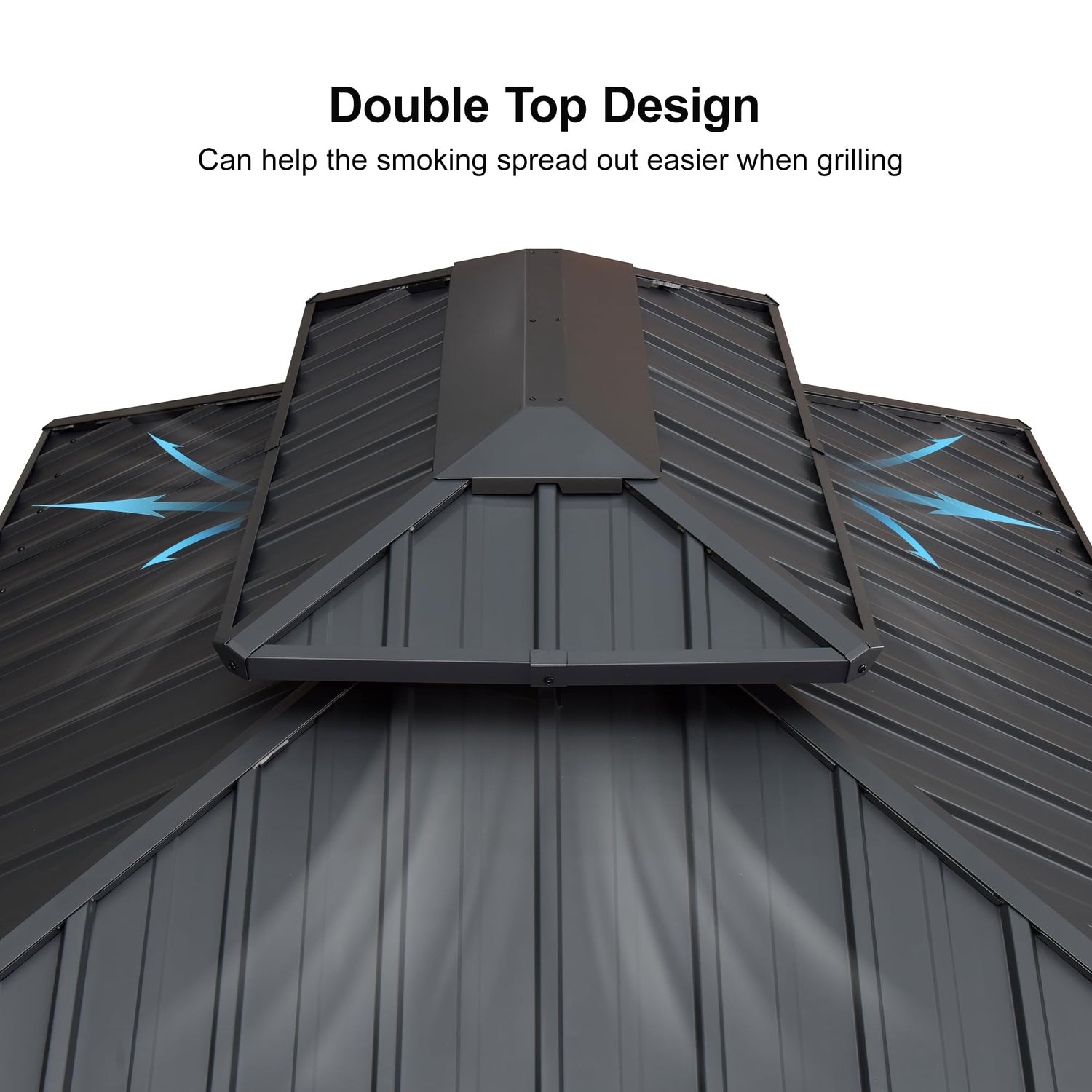- 2-Tier Galvanized Steel Top: Double vented roof which can help the smoking spread out easier when grilling. Galvanized steel roof, which meet flame-resistant safety standards, can effectively resist harmful UV rays and fade resistance.